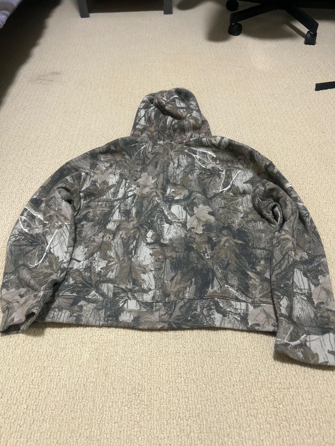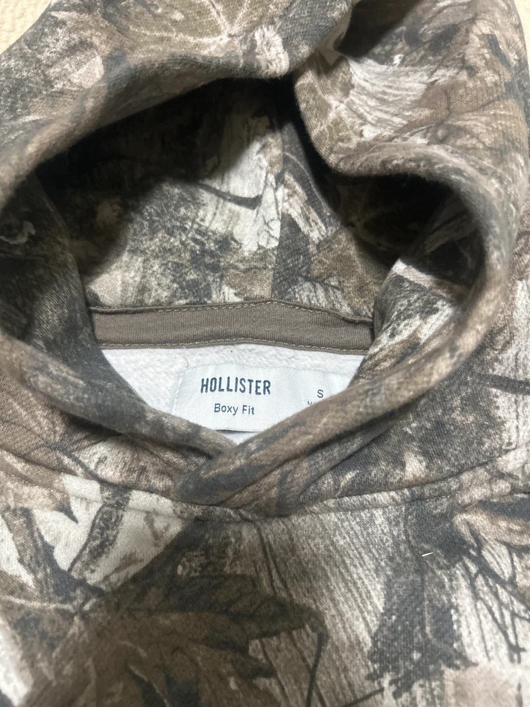 This is a Hollister camo hoodie with a boxy fit. It's a size small and made of a soft, fleecy material. Great for outdoor activities!