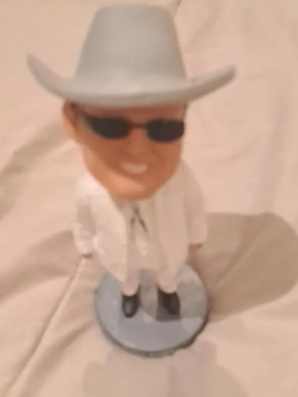 A fun bobblehead figure wearing a cowboy hat, sunglasses, and a white suit. It's mounted on a blue base. This decorative item adds a unique touch to any space!