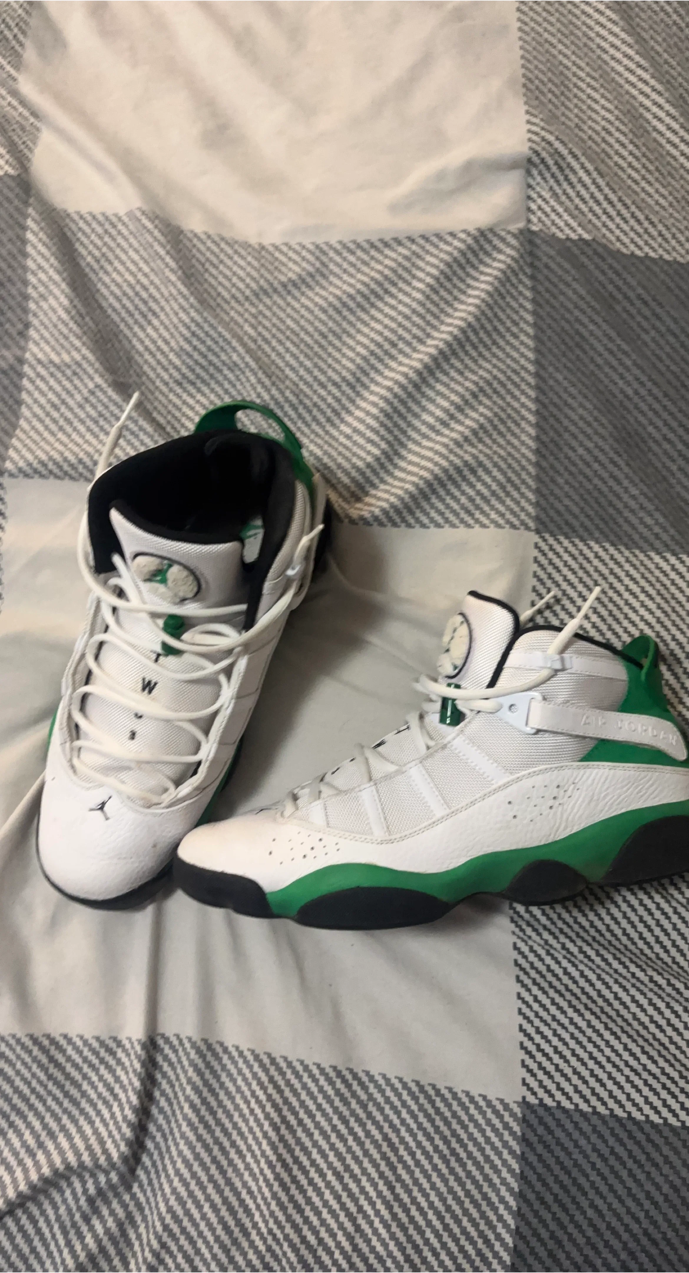 White and green Air Jordan 6 Rings sneakers. These kicks feature a mid-top design with lace closure and a velcro strap. Great for everyday wear or hitting the court!