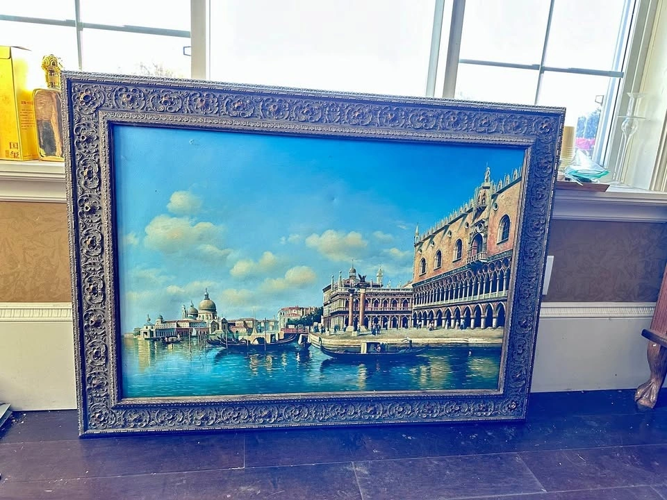This vibrant artwork captures a sunlit view of Venice, with gondolas drifting along shimmering blue waters and historic architecture rising in rich detail. Framed in an ornate, antique-style frame, it brings timeless European romance and grandeur to any space.