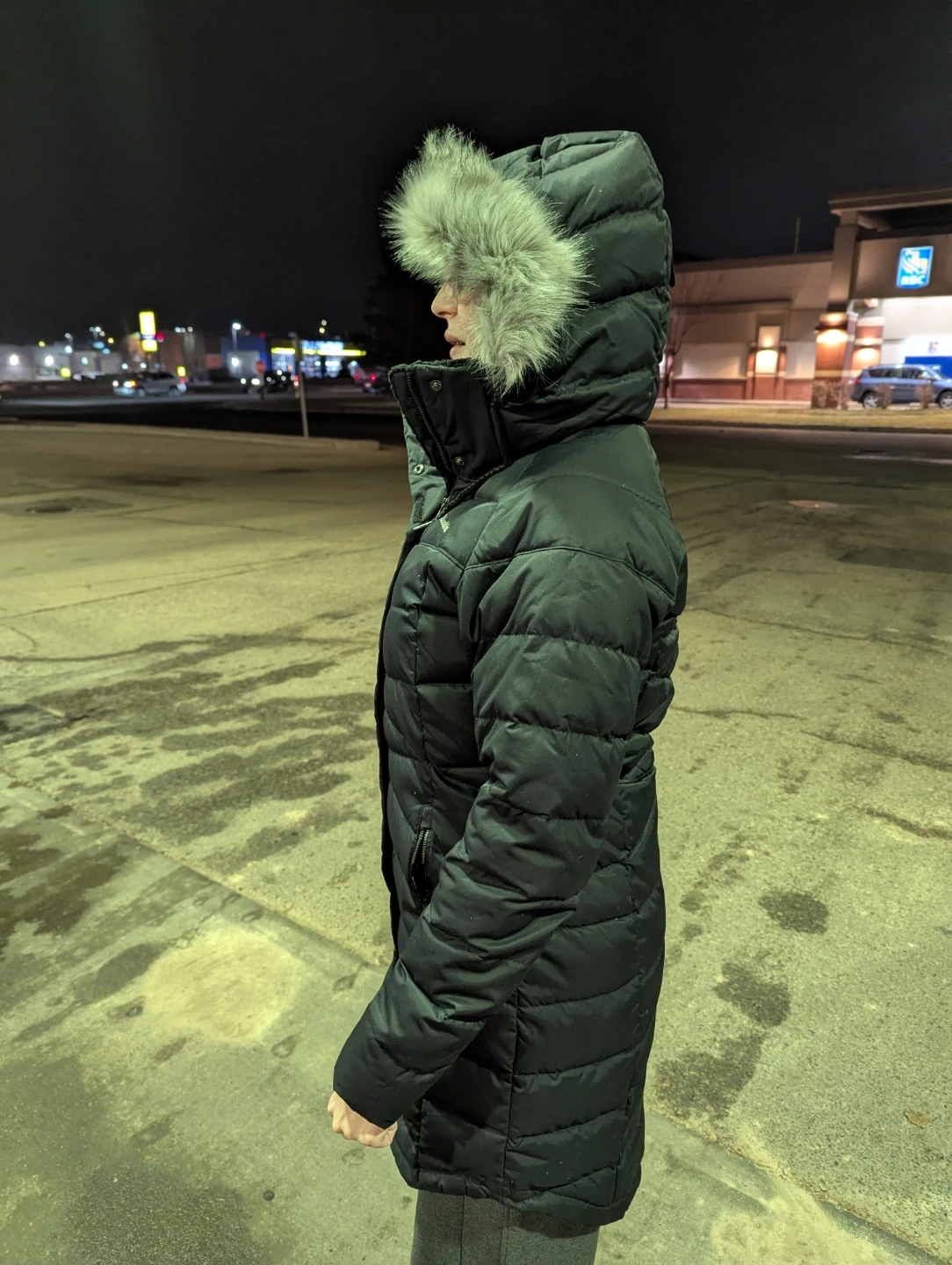 Columbia black puffer winter coat with a detachable faux fur trim on the hood. It's insulated for warmth and has a full zip closure. Features zippered pockets to keep your hands warm.