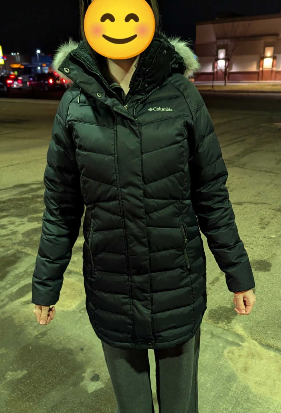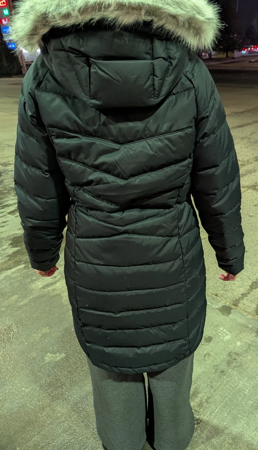 Columbia black puffer winter coat with a detachable faux fur trim on the hood. It's insulated for warmth and has a full zip closure. Features zippered pockets to keep your hands warm.