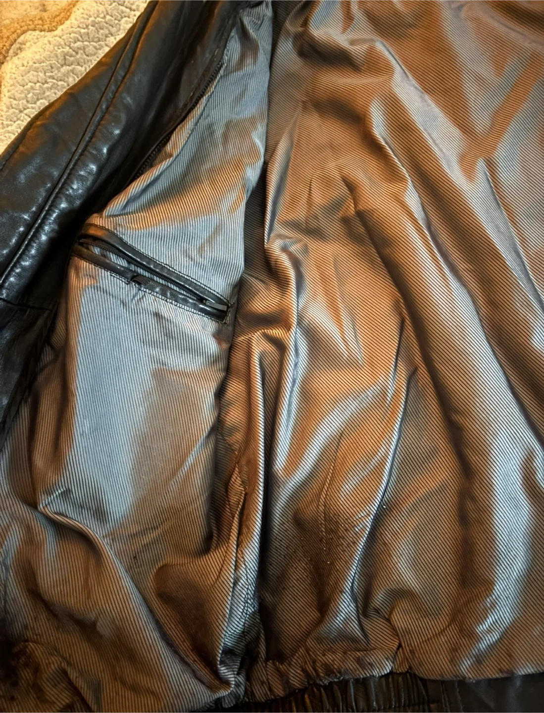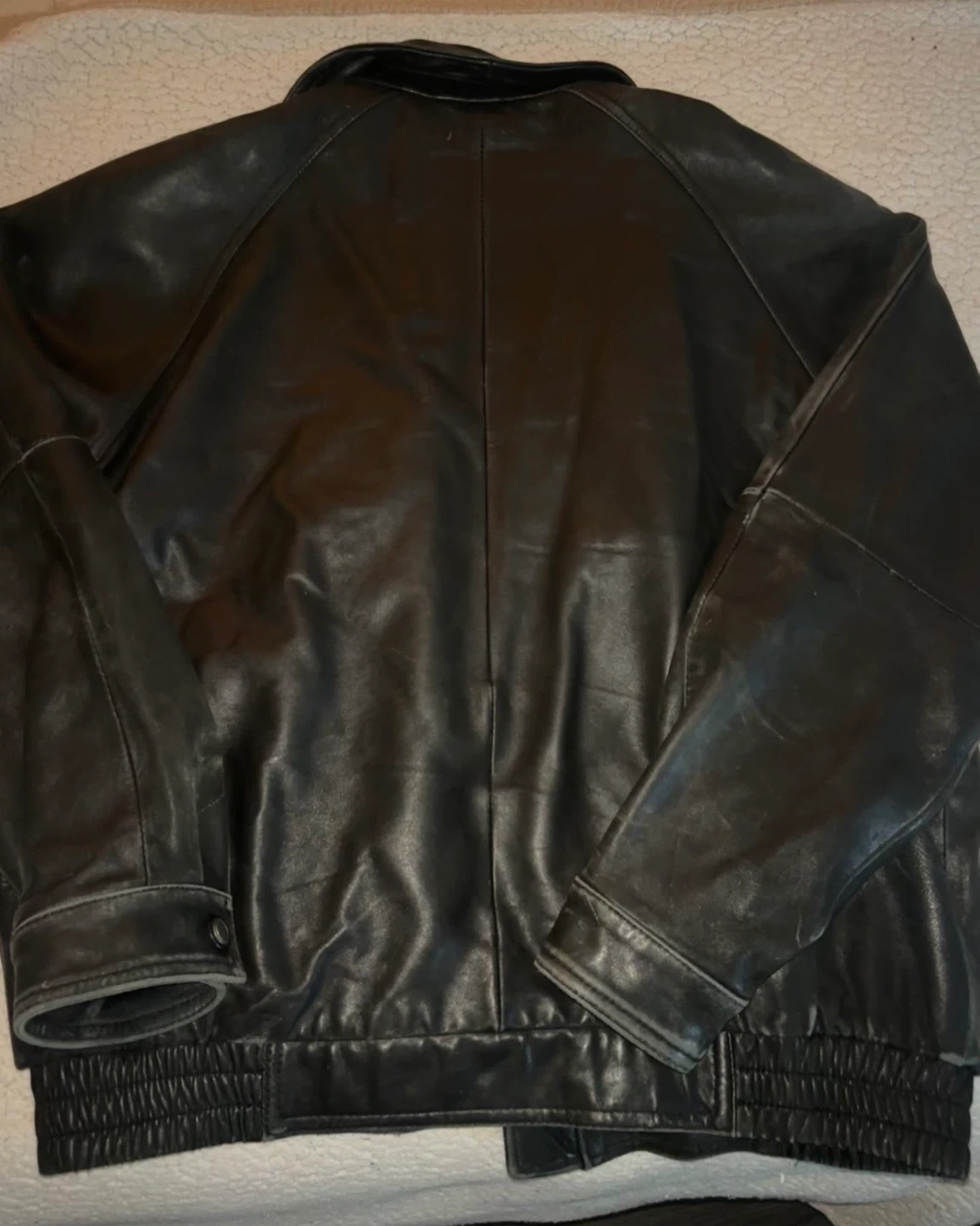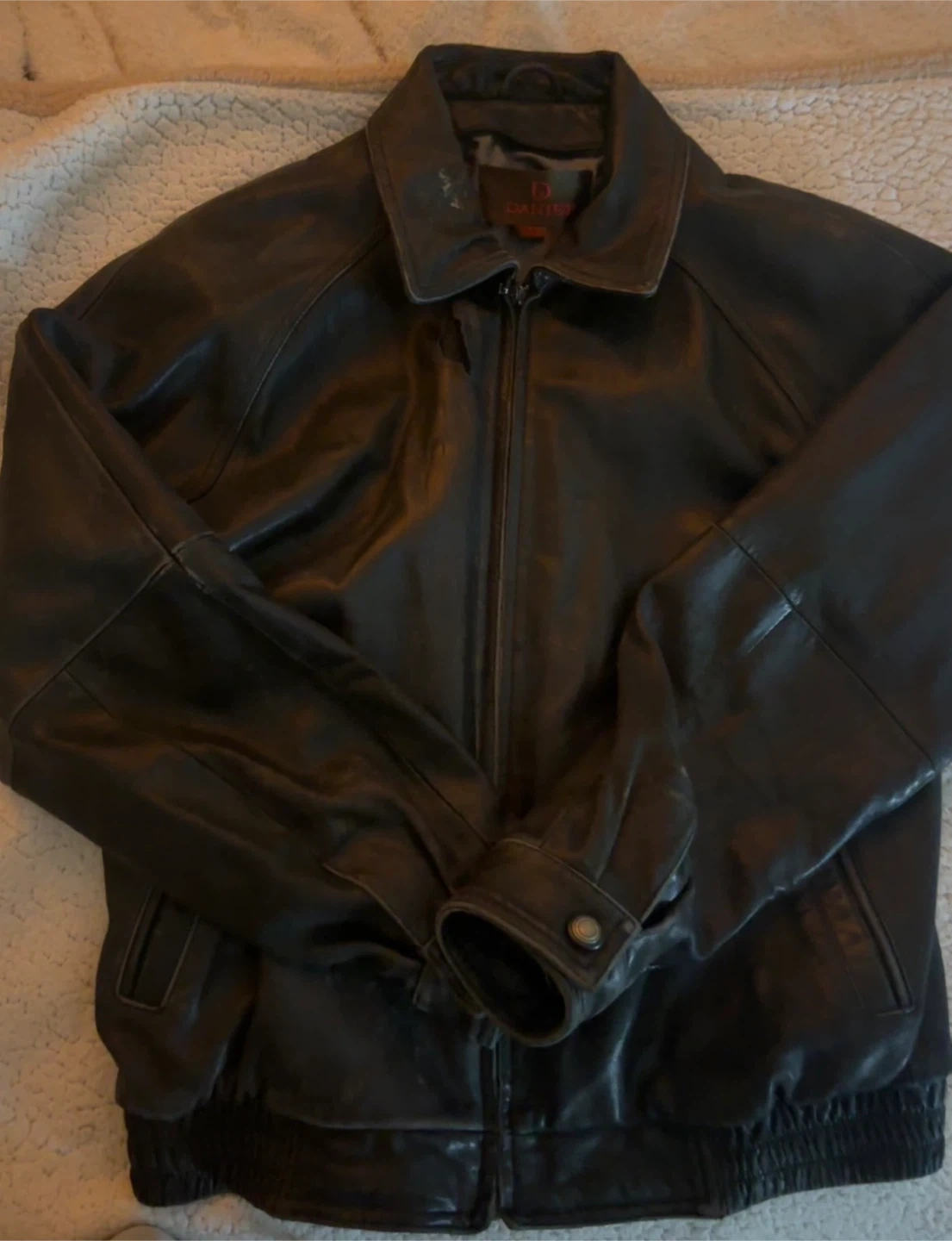 This is a black Danier leather jacket. It's a size M/M. The jacket has a zip-up front and two front pockets. It also features an inside pocket. It has a slight tear on the top of the collar.