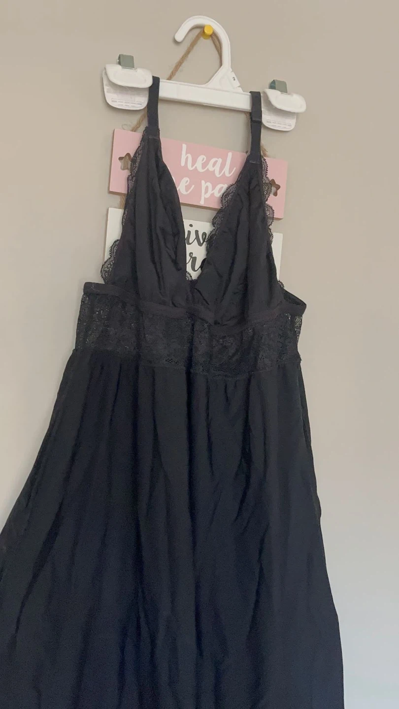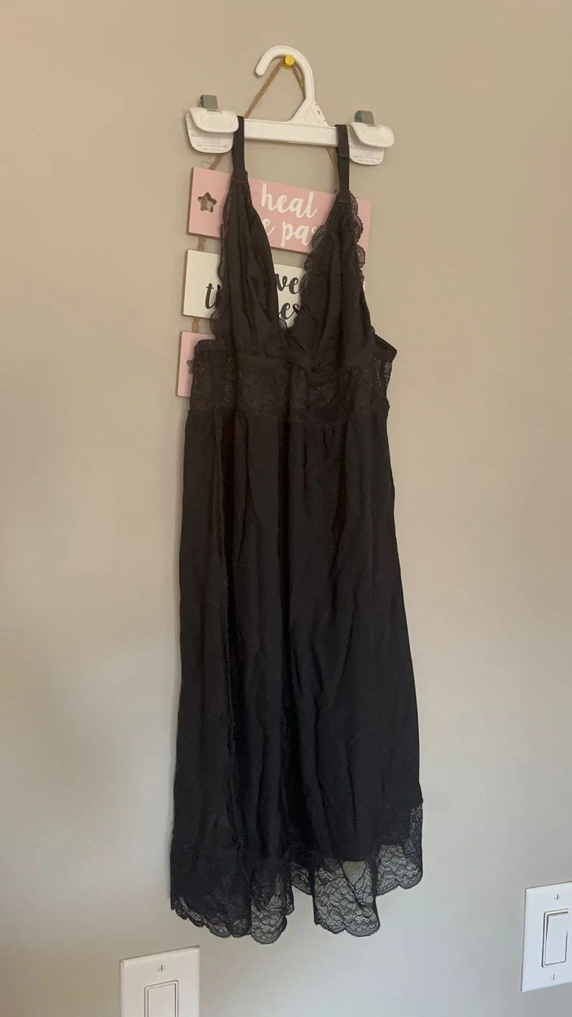 A lovely black nightgown with delicate lace trim detailing. It features adjustable spaghetti straps and a flattering V-neckline. The fabric feels soft and drapes beautifully.