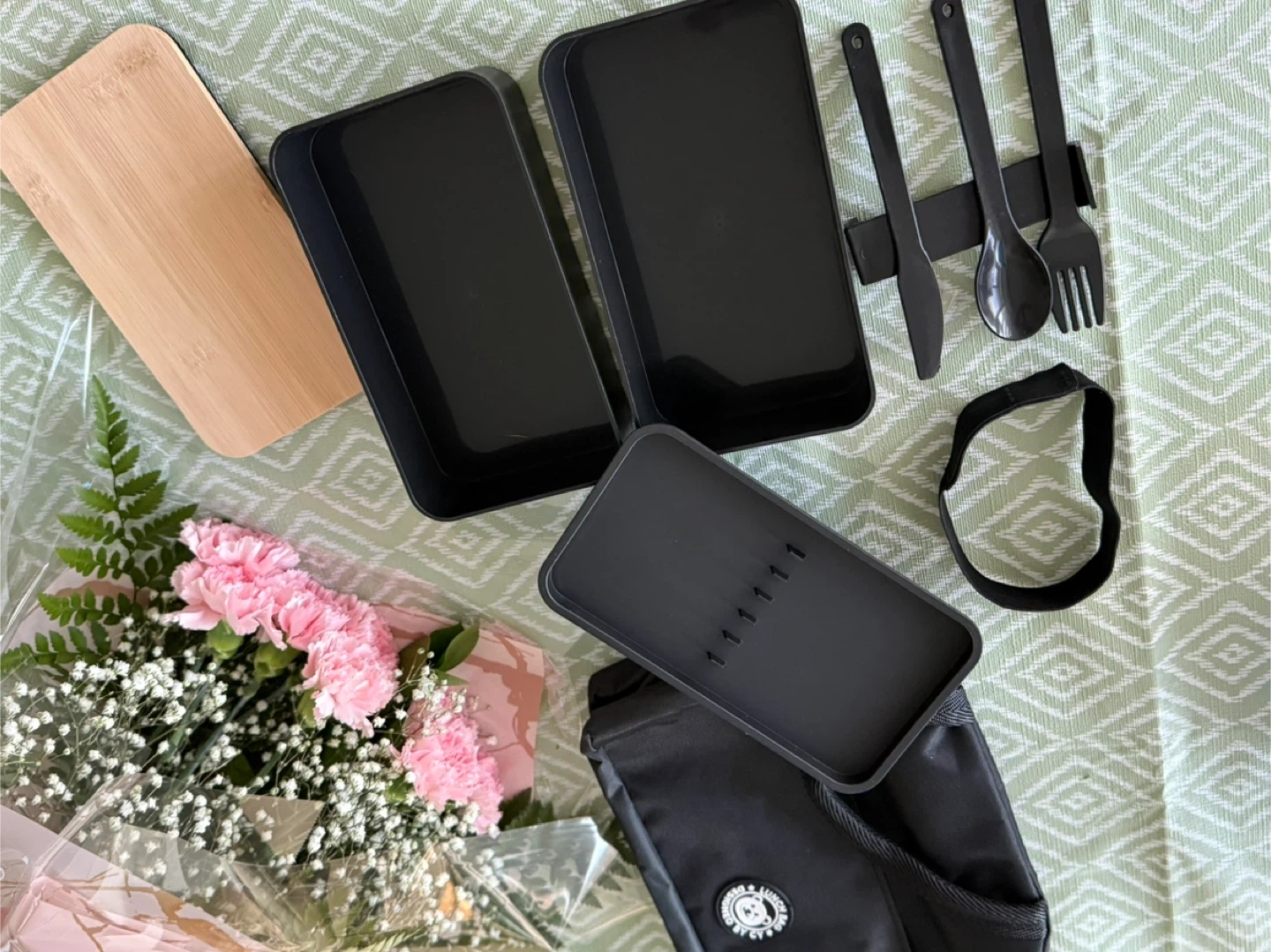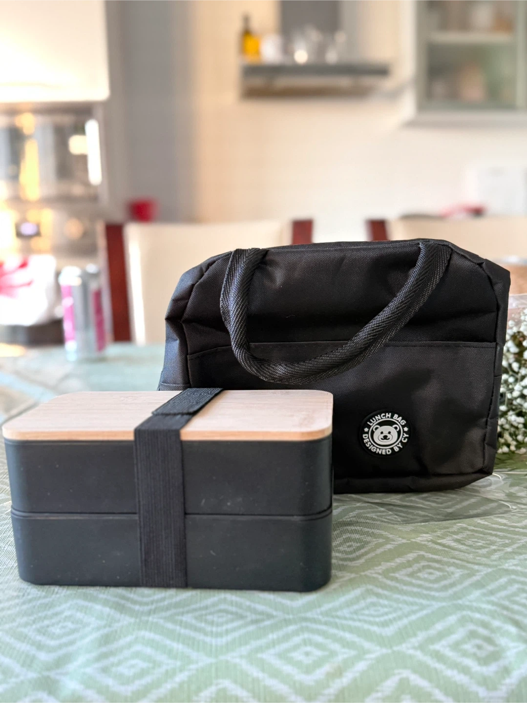 Also has a black insulated lunch bag and a matching black utensil set - fork, spoon, knife. Super handy for work or school lunches.