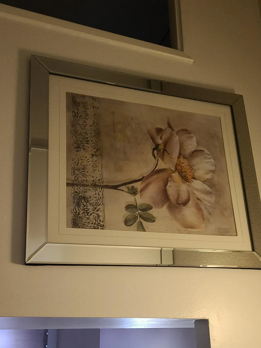 Add a touch of elegance to any room with this beautiful framed art print. It features a delicate floral design with subtle textured details. The mirrored frame adds a modern and sophisticated flair