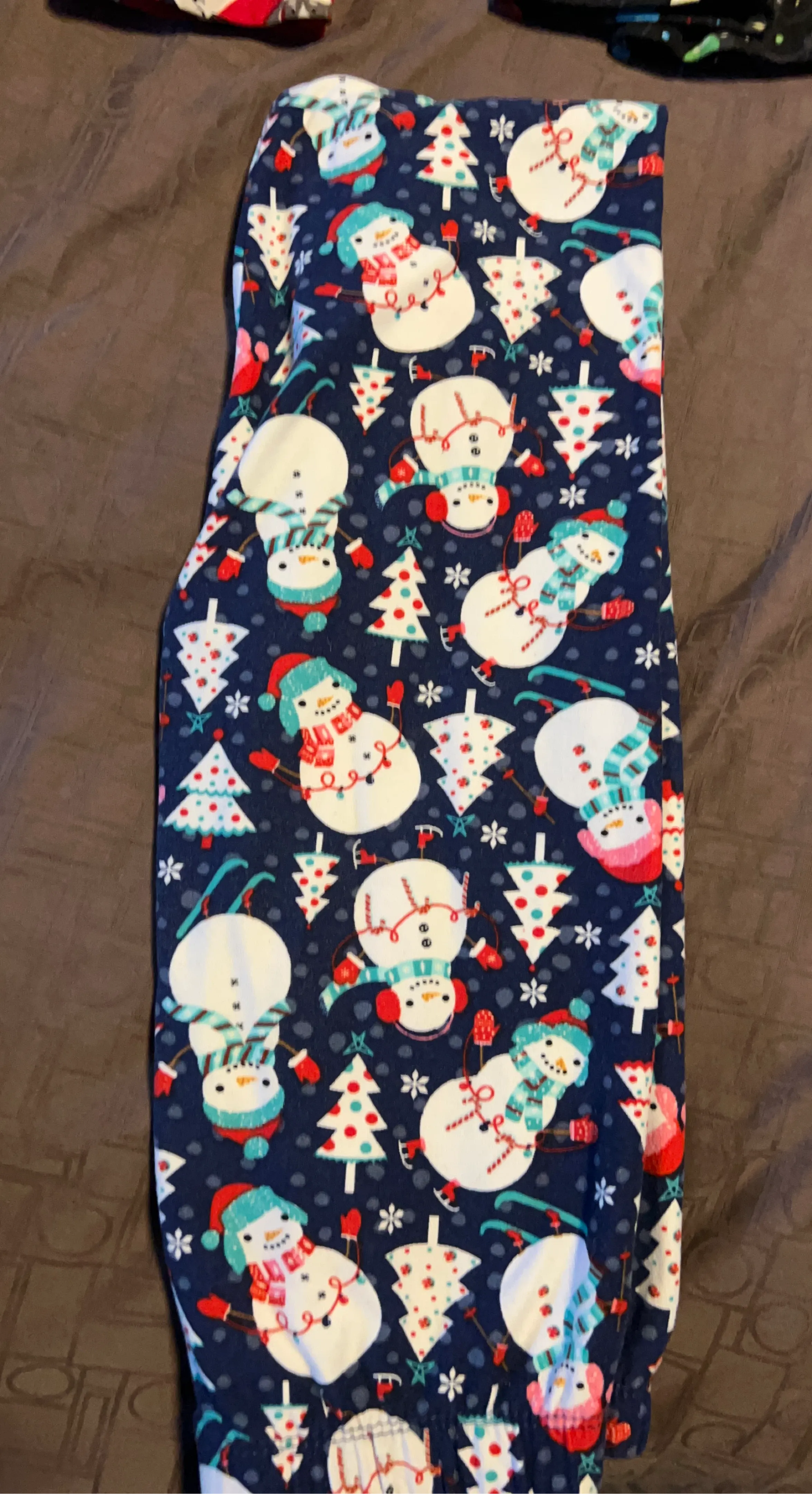 Cozy Sweetlegs leggings with a cute snowman and Christmas tree pattern. They're made of a soft, stretchy material perfect for the holidays! The fabric is a polyester blend.
