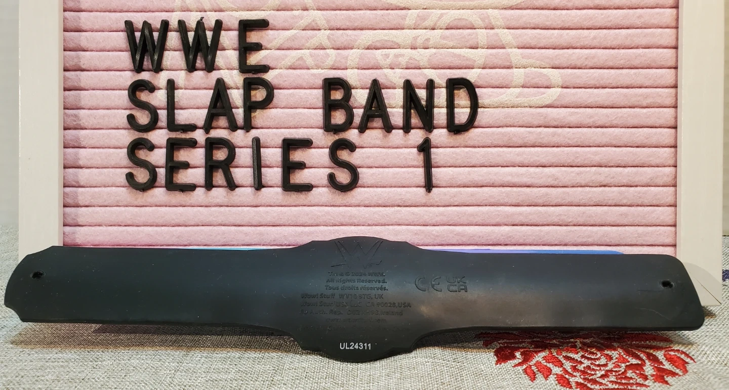 This is the WWE Intercontinental Champion slap band from Series 1. It's made in China and features the WWE logo. A fun accessory for any wrestling fan!
