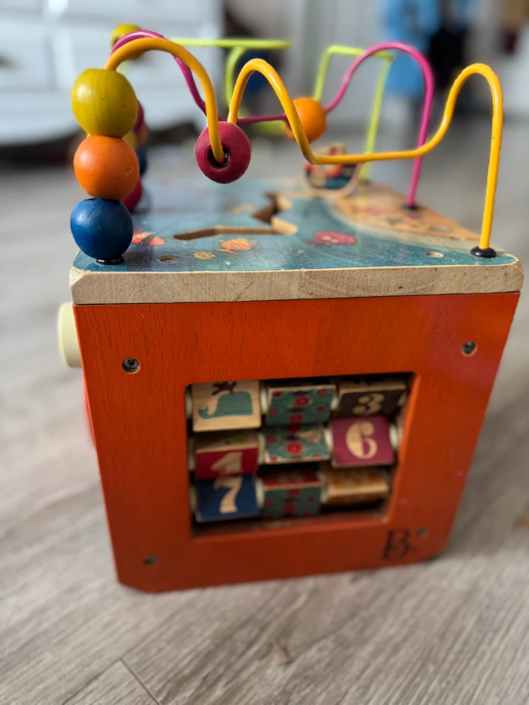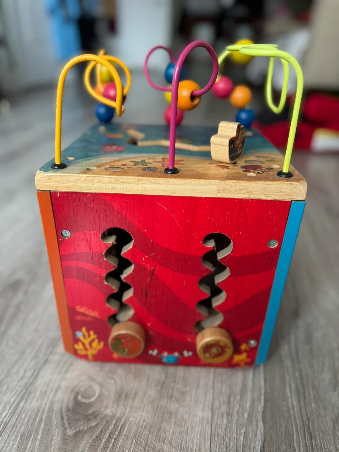 This is a wooden activity cube with a bead maze and various interactive panels. It's designed with a fun marine theme. Great for developing fine motor skills! Keeps the baby busy and entertained for a very long time..