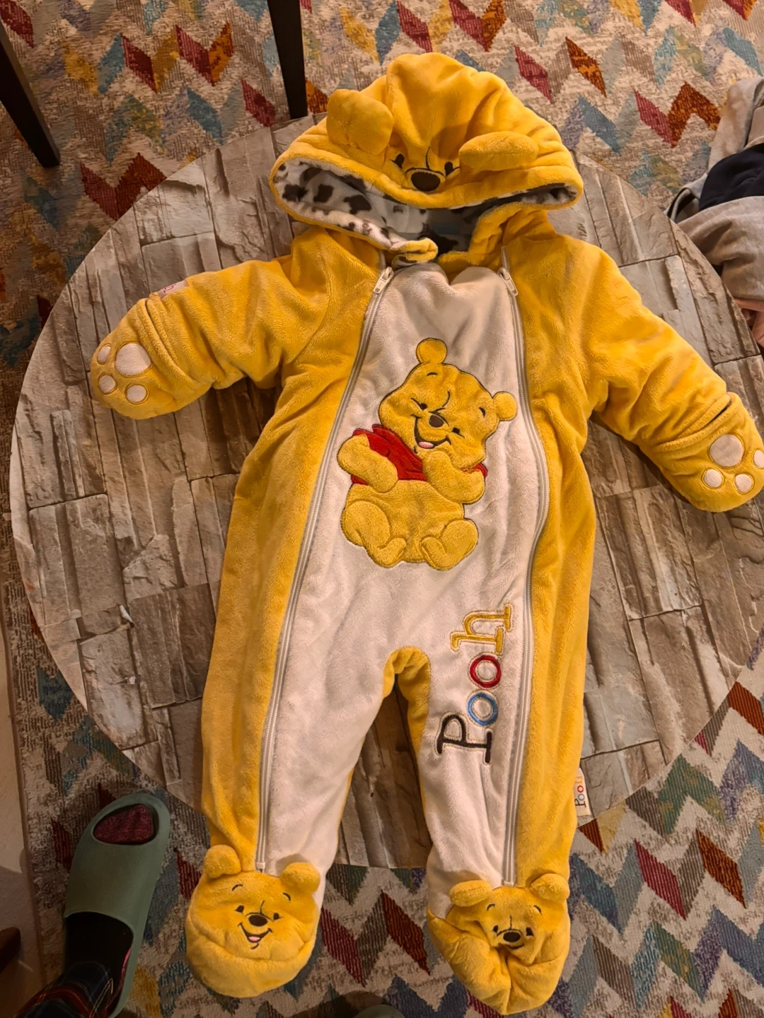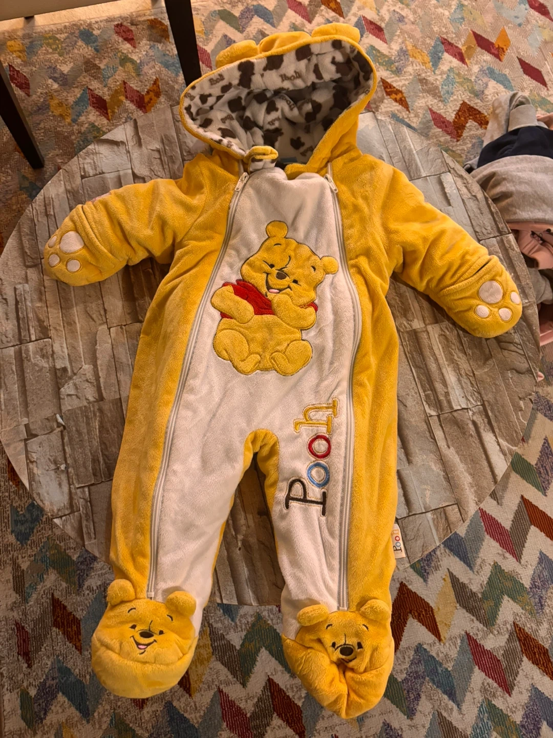 Super cute Winnie the Pooh snowsuit for your little one! It's yellow and has Pooh embroidered on the front. Perfect for keeping your baby warm and cozy during the winter months.