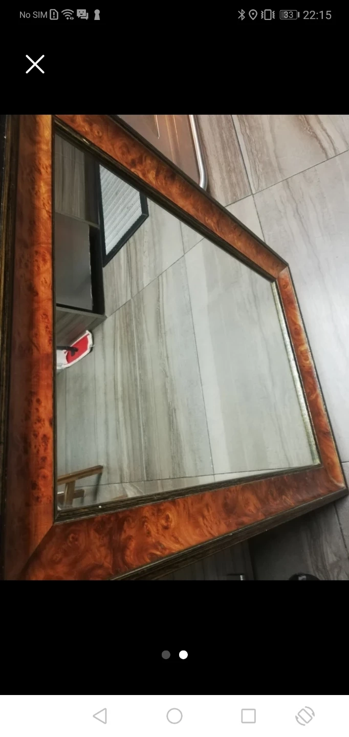 A stylish framed mirror with a wood-grain effect border. It's perfect for adding a touch of elegance to any room. The frame has a warm, glossy finish. Cash only, thanks.