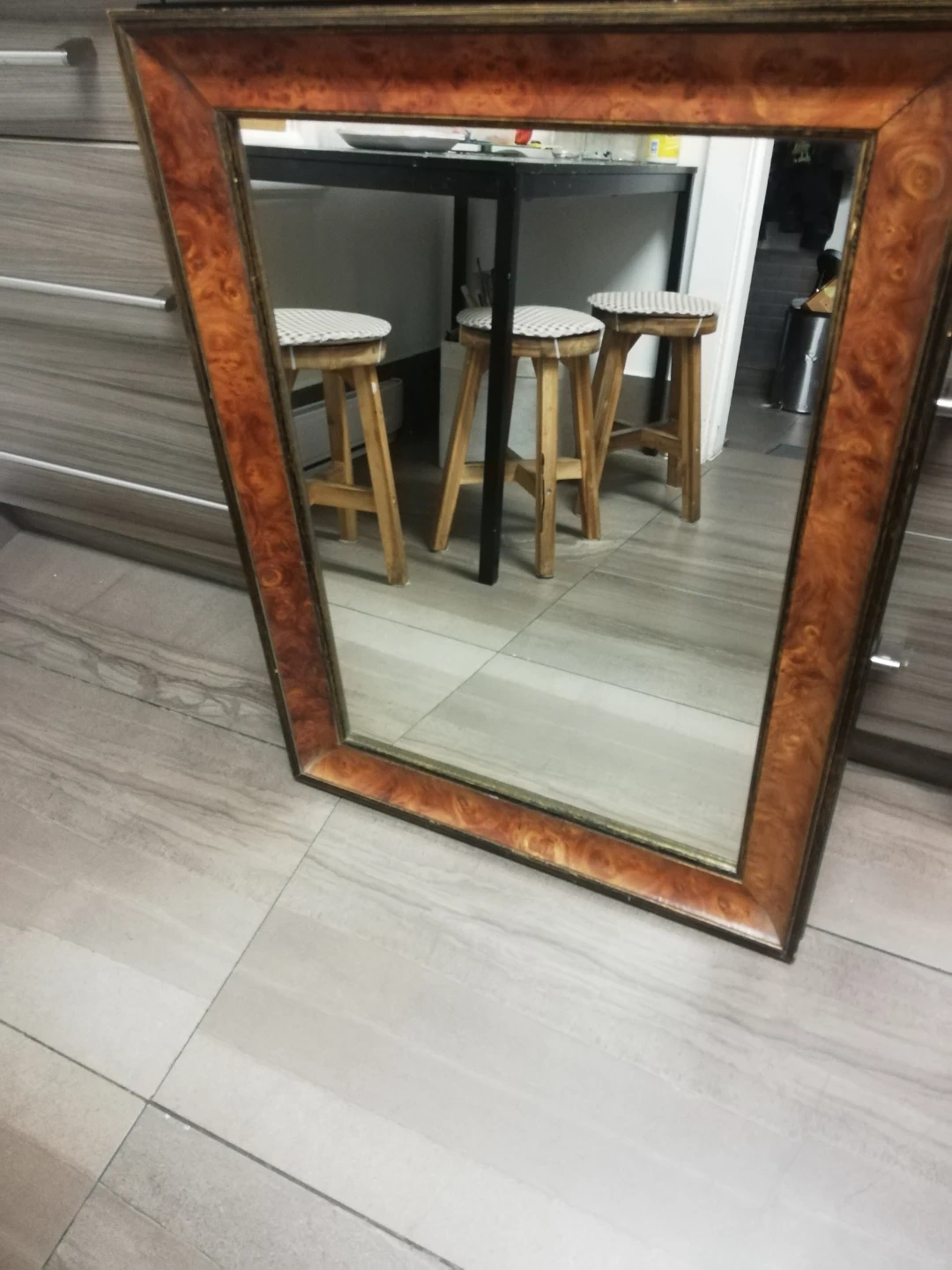 A stylish framed mirror with a wood-grain effect border. It's perfect for adding a touch of elegance to any room. The frame has a warm, glossy finish. Cash only, thanks.