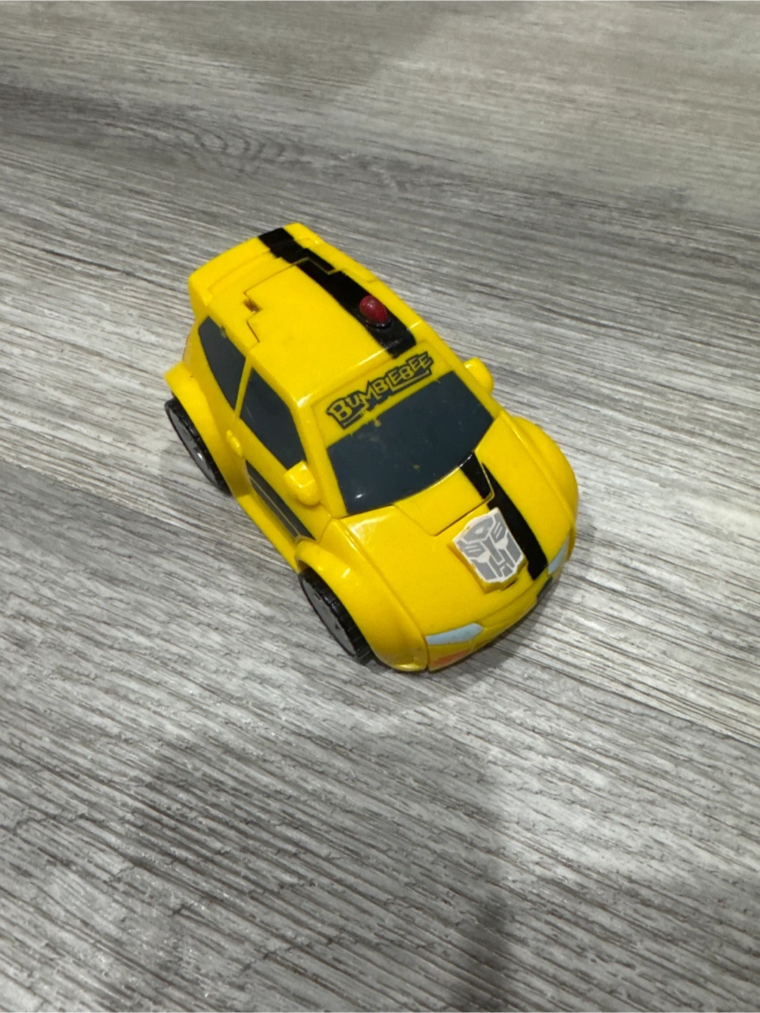 This is a yellow Transformers Bumblebee toy that converts from a car to a robot. It features the Autobot logo and black racing stripes. Made of plastic.