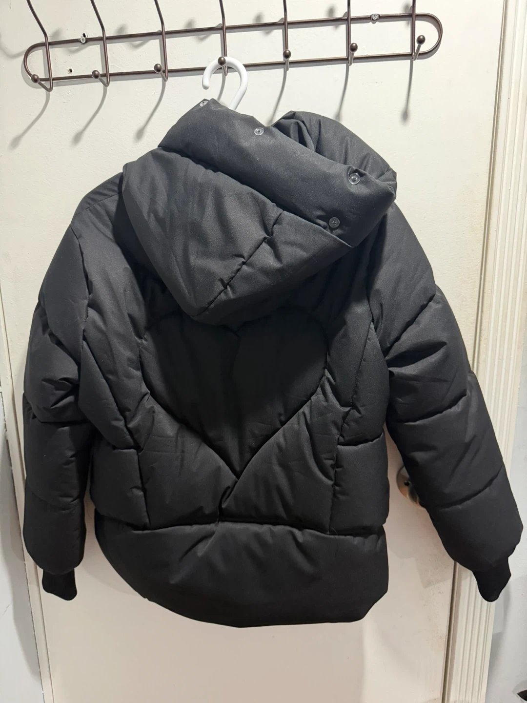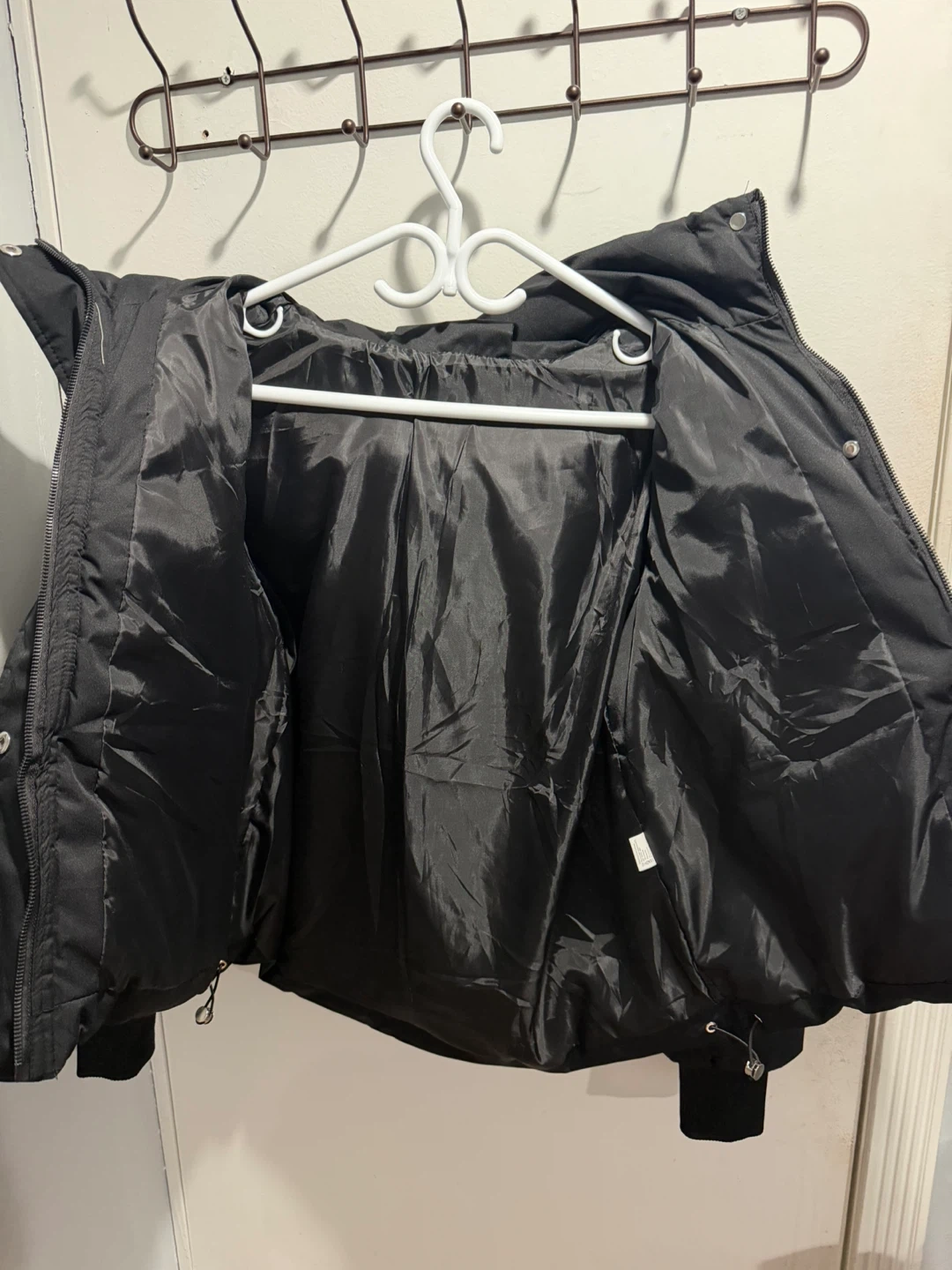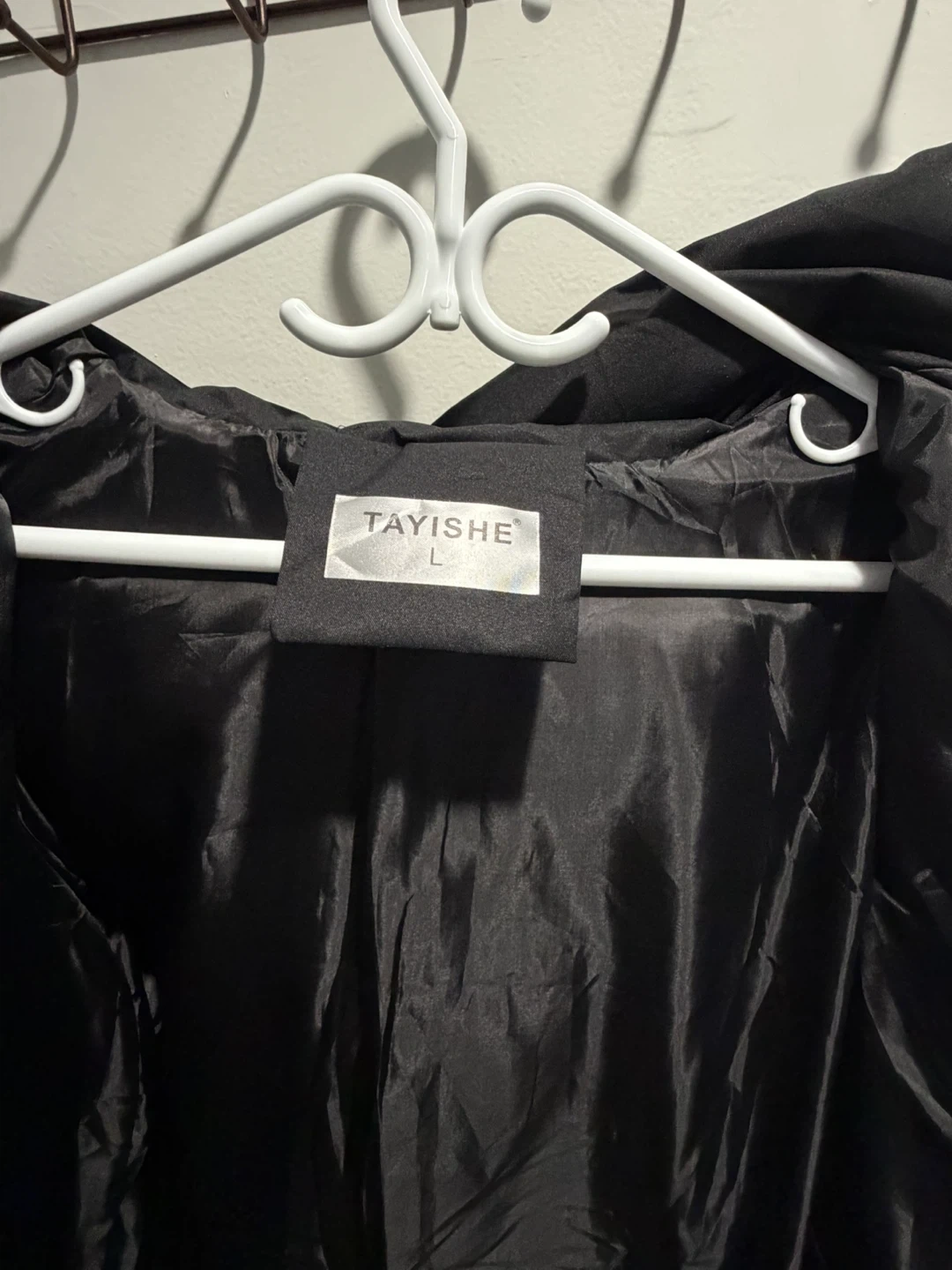 This is a black puffer jacket by TAYISHE. It's a size large with a hood. The jacket has a zippered front and pockets.