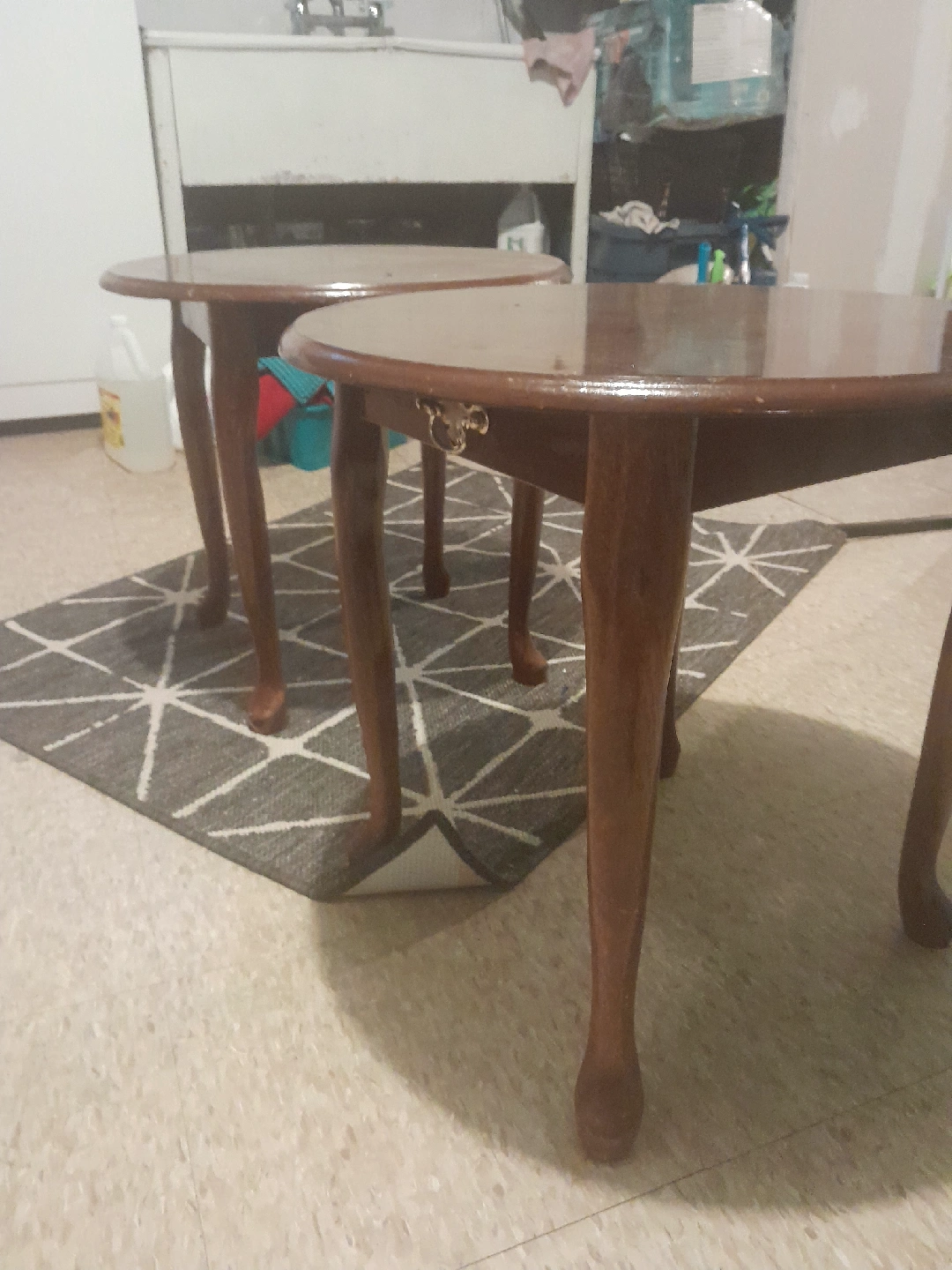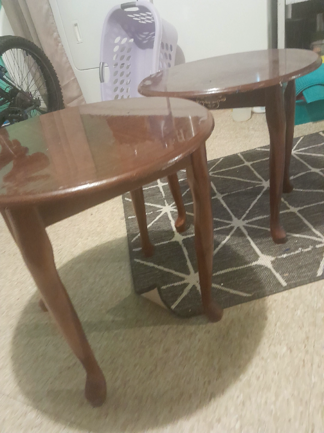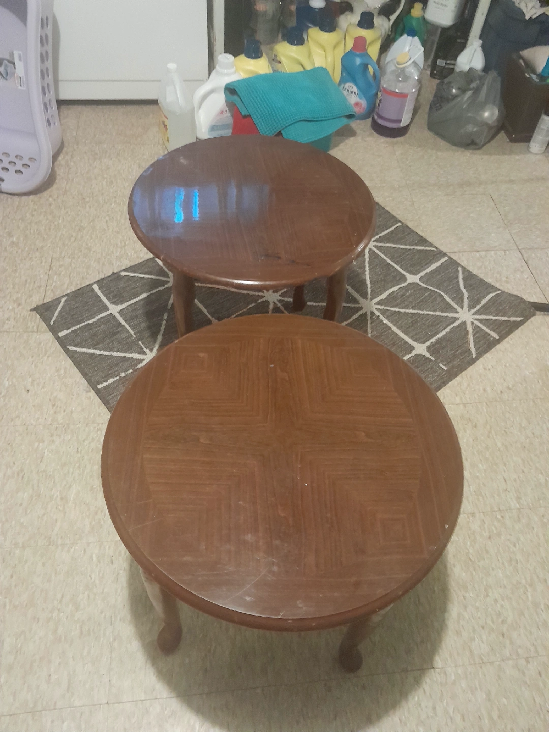Selling a set of two cute round side tables! They're a lovely brown wood and would look great in any living room or bedroom.