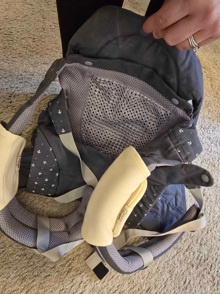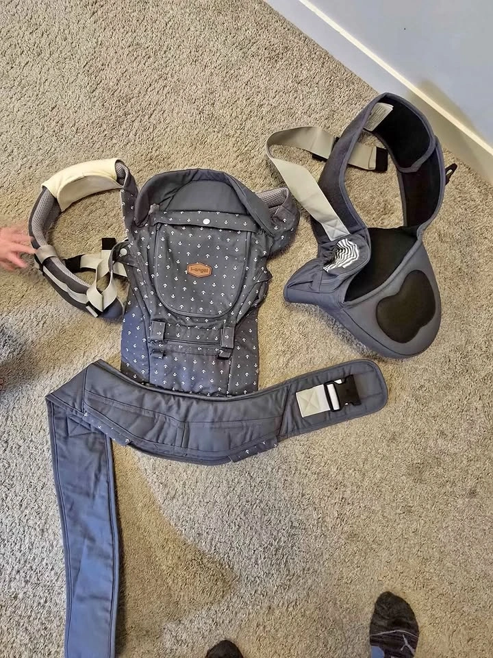 Durable i-angel baby carrier in grey with a white anchor print. This hip seat model features a breathable mesh front panel for airflow, padded shoulder straps, and a wide waist belt for support. Includes the removable hip seat base. Pick up in Seton.