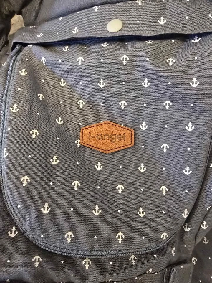 Durable i-angel baby carrier in grey with a white anchor print. This hip seat model features a breathable mesh front panel for airflow, padded shoulder straps, and a wide waist belt for support. Includes the removable hip seat base. Pick up in Seton.