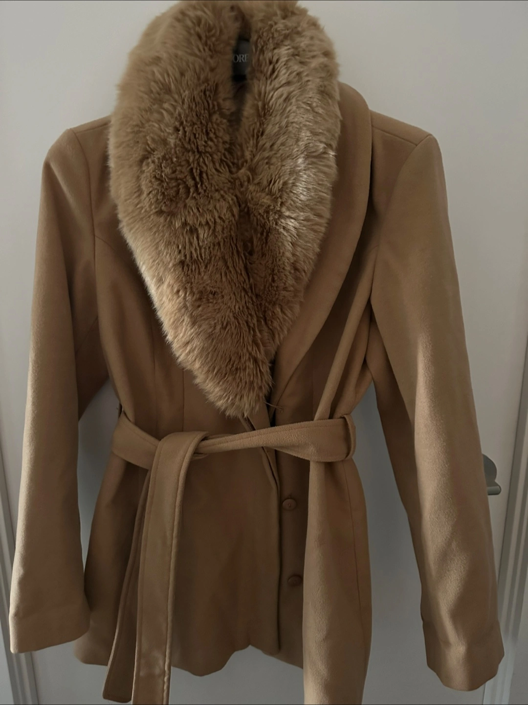*Like New* Beautiful ladies tan coat with removable faux fur collar. Ellabee products are made in Canada! Includes tie around the waist.