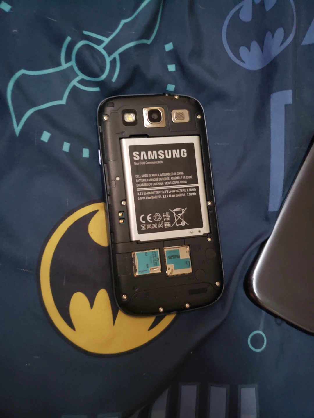 Samsung Galaxy S3 smartphone in dark grey. It's a classic Android phone with a decent camera and touchscreen. The battery is removable and it has slots for SIM and SD cards. Perfect for basic calls and texts!