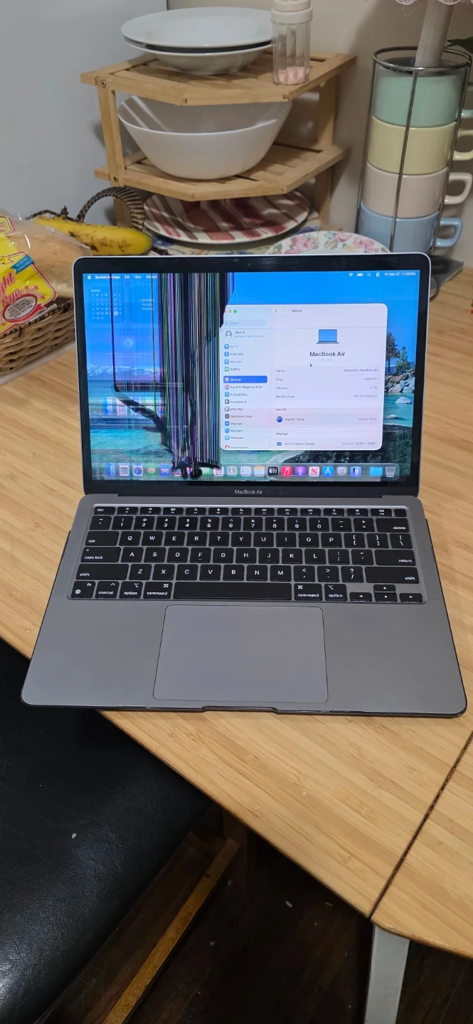 Apple MacBook Air M1 laptop, model A2337. The screen has visible damage with lines across the left side. It's a grey model. Includes original box. Otherwise everything working, battery health very good more than 8 hours u can use only macbook, u need replace new screen, if anyone interest knock me will send you number n this address parking place we can meet: