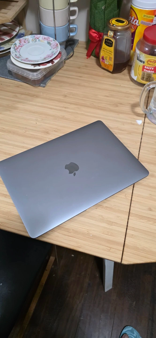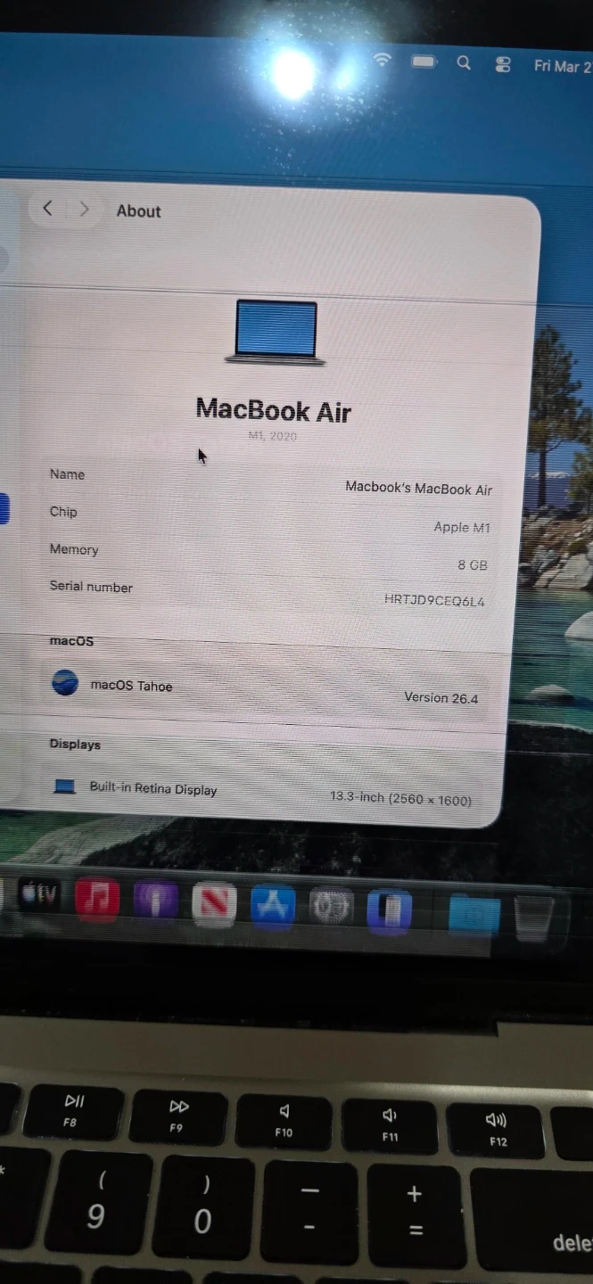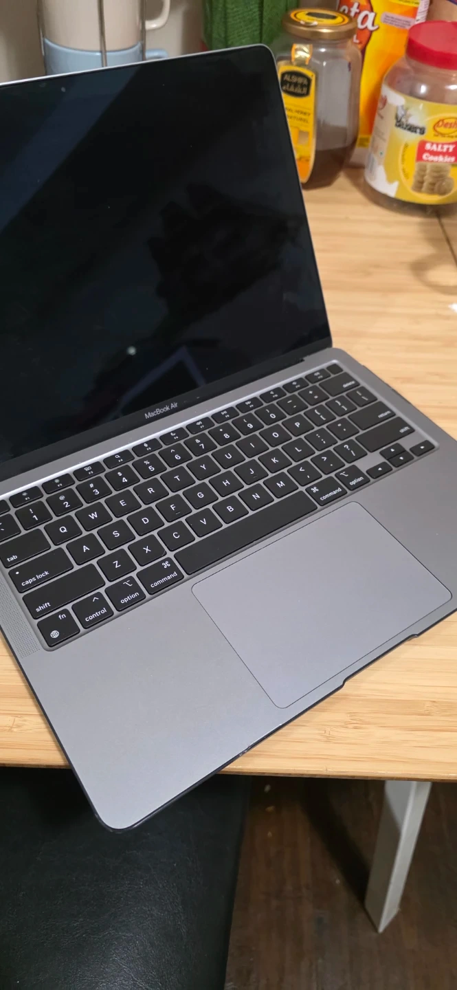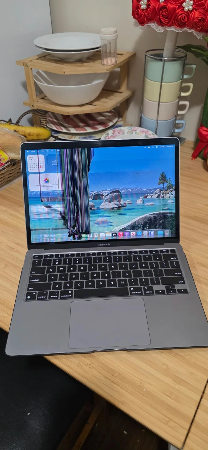 Apple MacBook Air M1 laptop, model A2337. The screen has visible damage with lines across the left side. It's a grey model. Includes original box. Otherwise everything working, battery health very good more than 8 hours u can use only macbook, u need replace new screen, if anyone interest knock me will send you number n this address parking place we can meet: