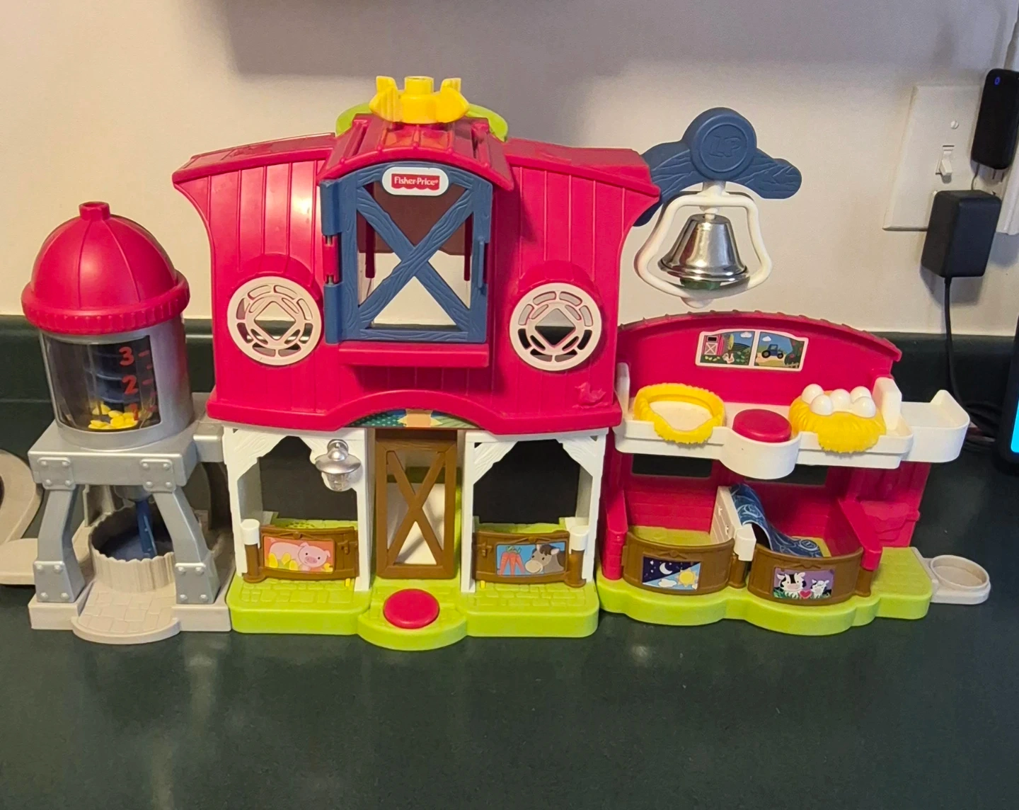 Fisher-Price Little People farm playset in bright pink and green. It has a silo, bell, and animal stalls. Includes nests with eggs and sheep wool accents.