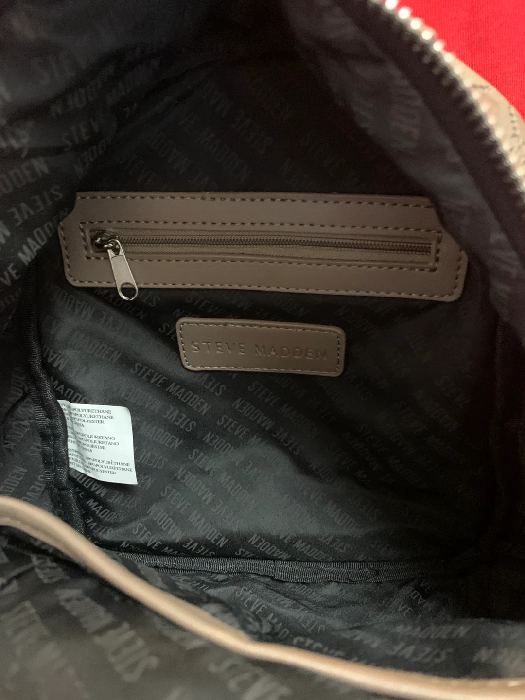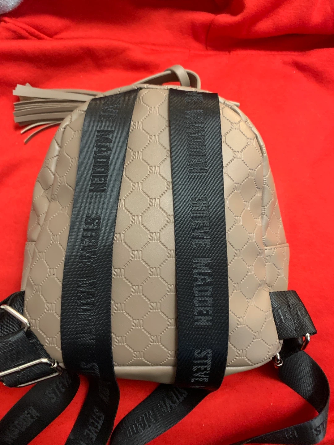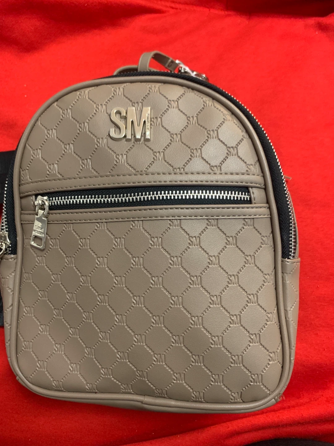 Taupe quilted backpack with SM logo detailing. It's made from faux leather and has adjustable straps. Features a front zip pocket and an interior zip pocket.