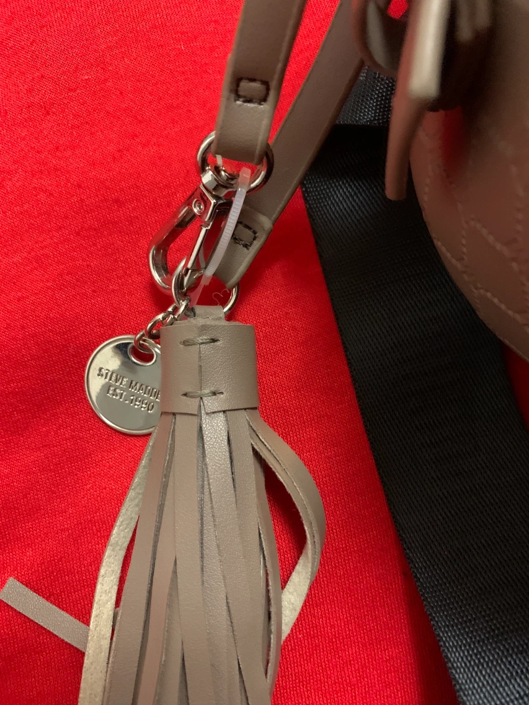 Taupe quilted backpack with SM logo detailing. It's made from faux leather and has adjustable straps. Features a front zip pocket and an interior zip pocket.