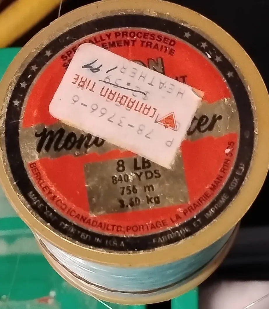This is a spool of Berkley Canadian Tire MONO fishing line. It's 8 LB test, 840 yards or 756 meters long. This line is Heather colour.