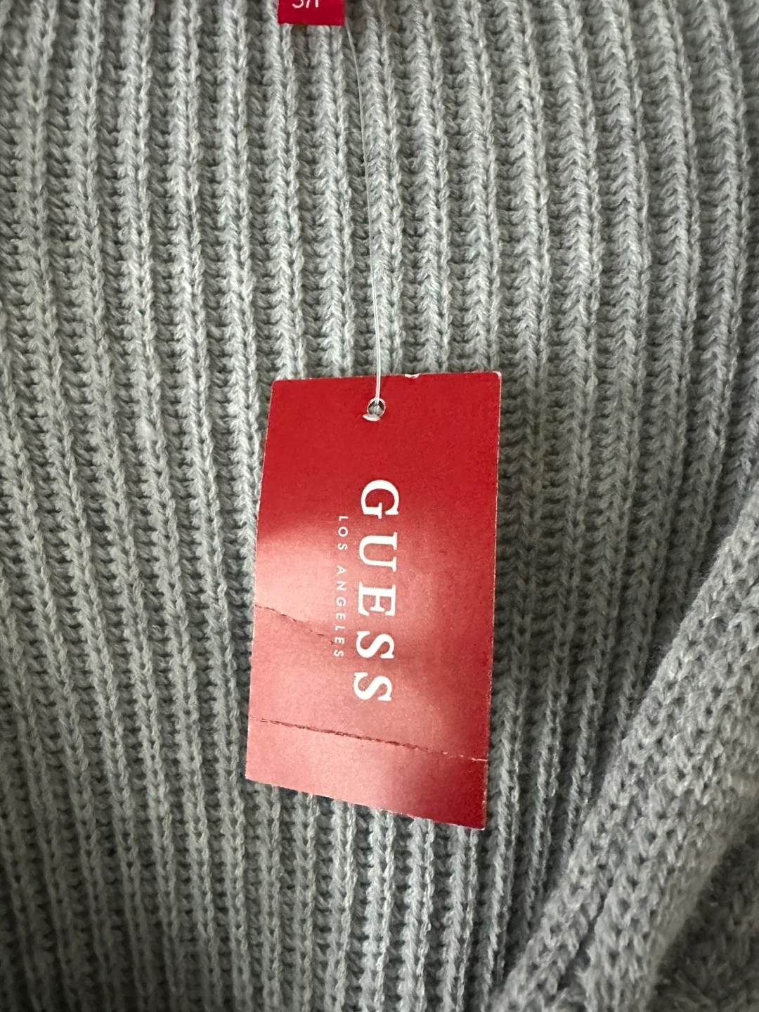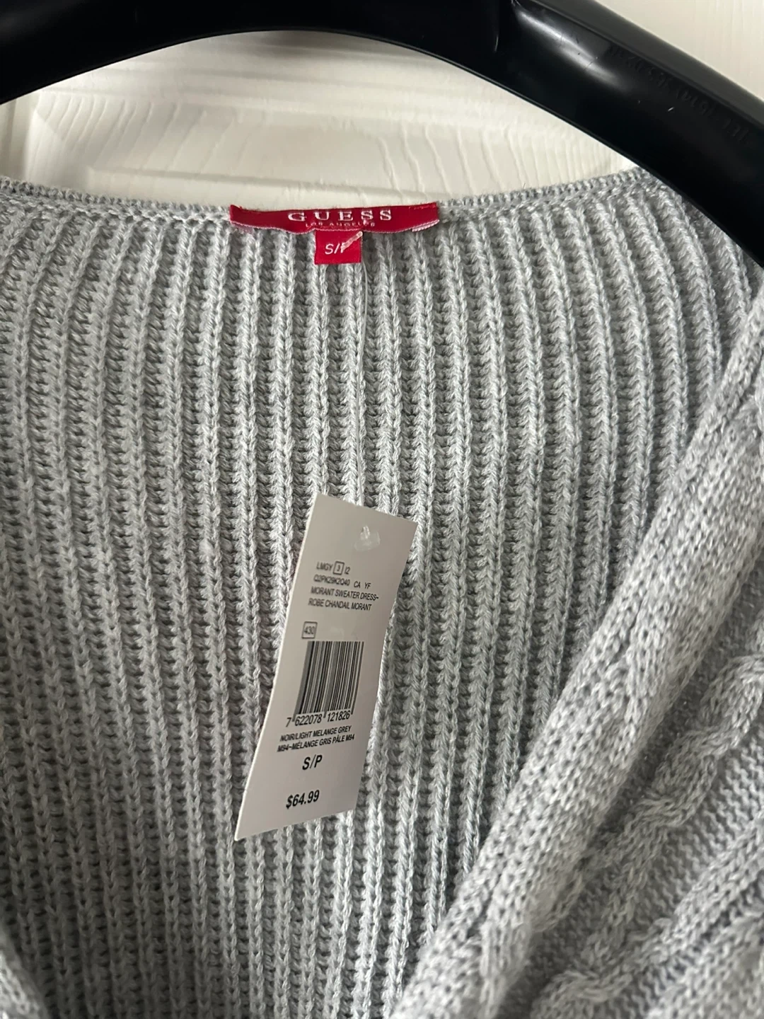 Guess wrap sweater dress in a light melange grey colour. It's a size S/P. Features a tie belt and a cable knit design on the sleeves and shoulders. Made from a cozy knit material.