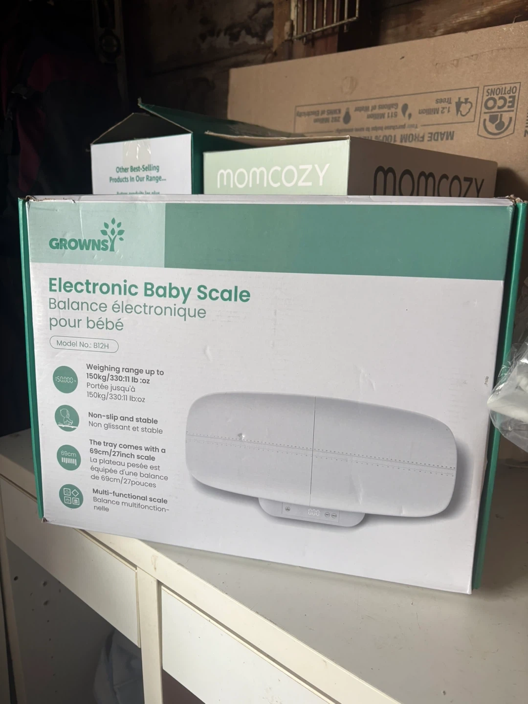 This is a Growns electronic baby scale with model B12H. It has a weighing range up to 150kg/330lb. The tray included with the scale measures 69cm/27inch. It's non-slip and stable.