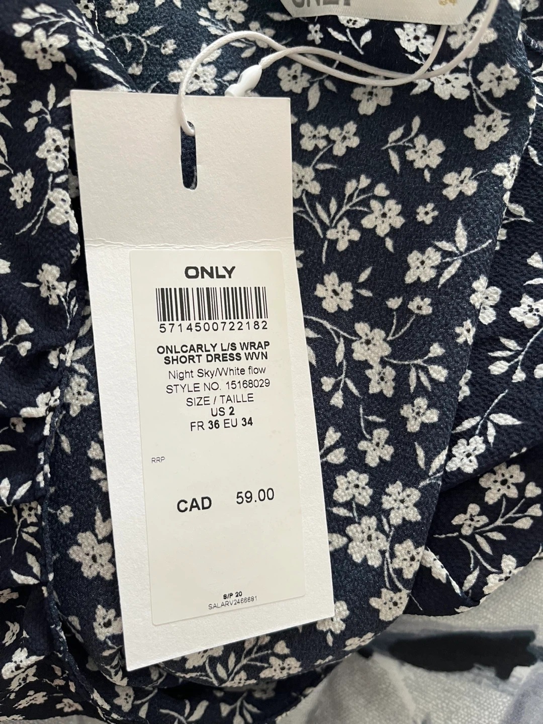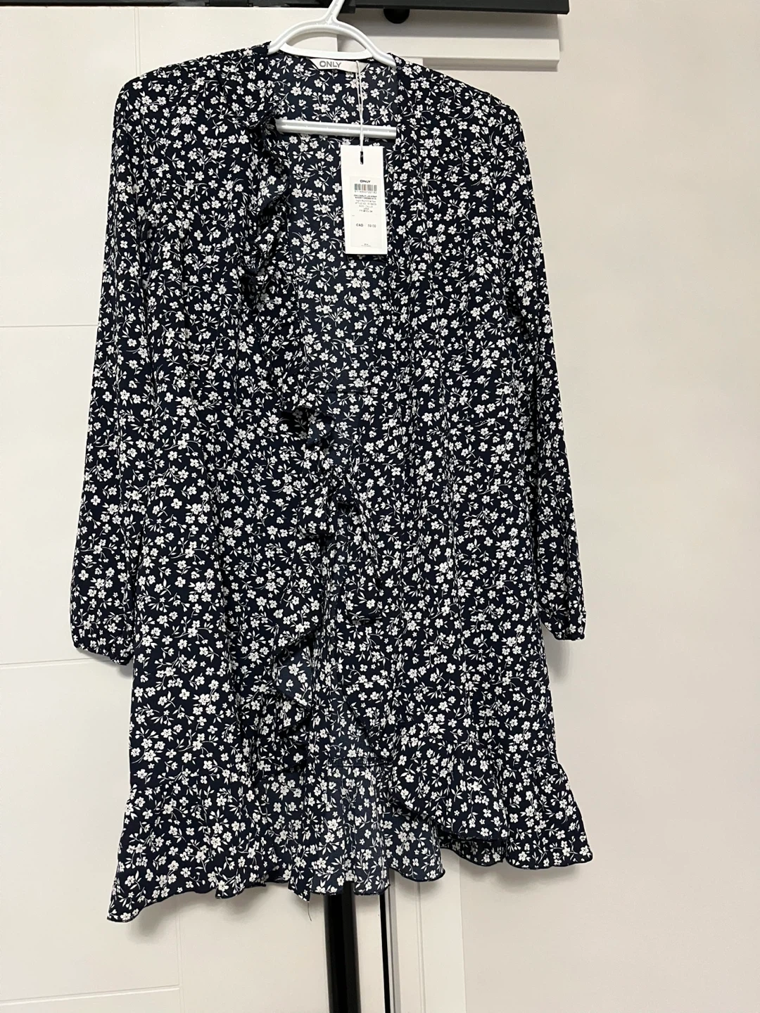 ONLY Carly L/S Wrap Short Dress in a Night Sky and White floral print. It's a size US 2. Features ruffles and a tie waist.