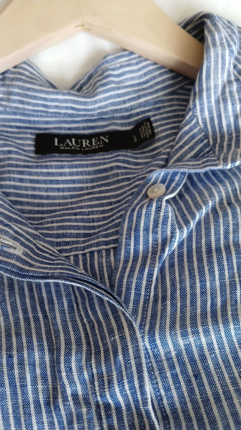 Beautiful ladies pinstripe blue blouse size large for $5.00. It's in excellent condition and no damage. I bought it about five years ago for an outdoor party. Just clearing my closet. Needs a gentle wash. Porch pickup at Dufferin and Bloor st.