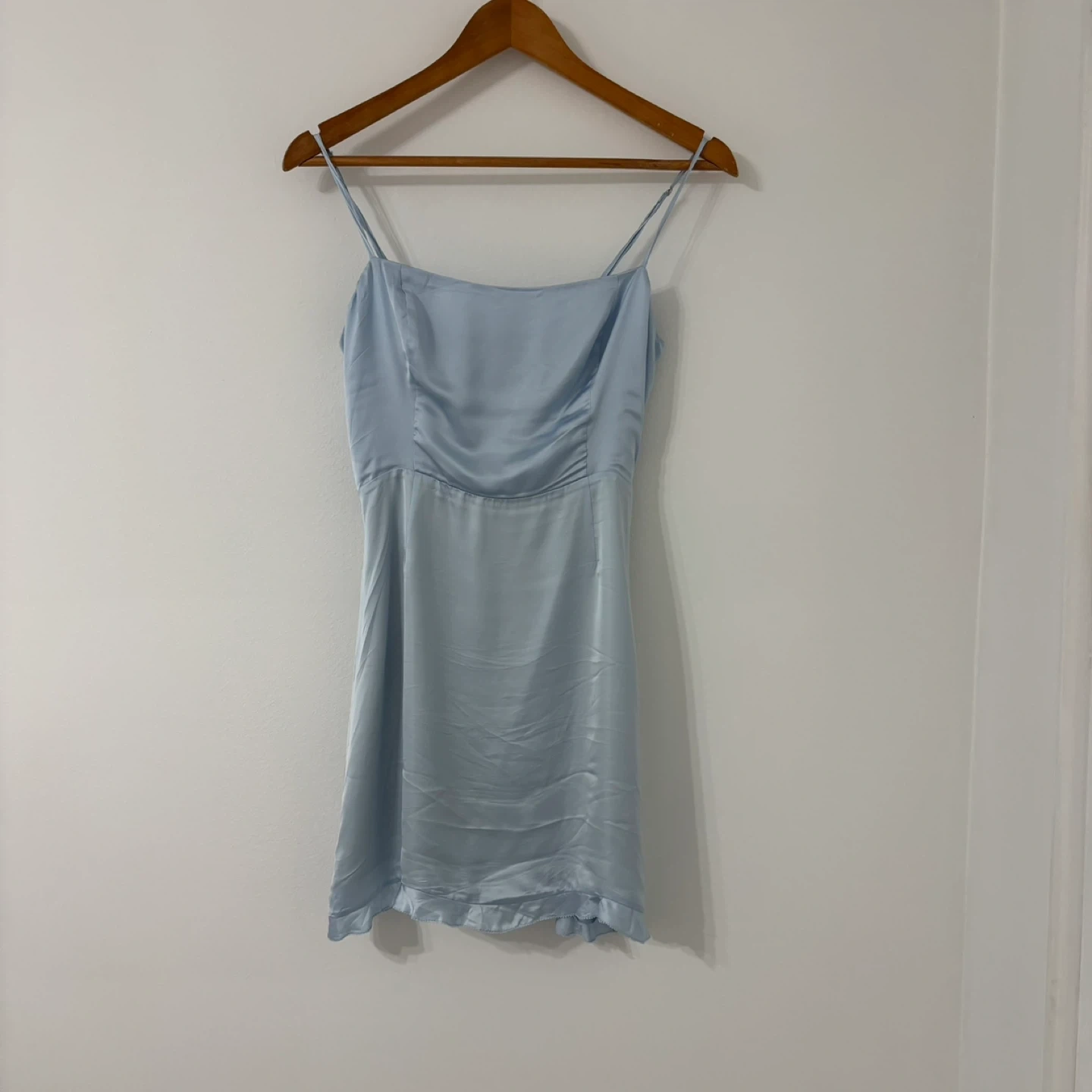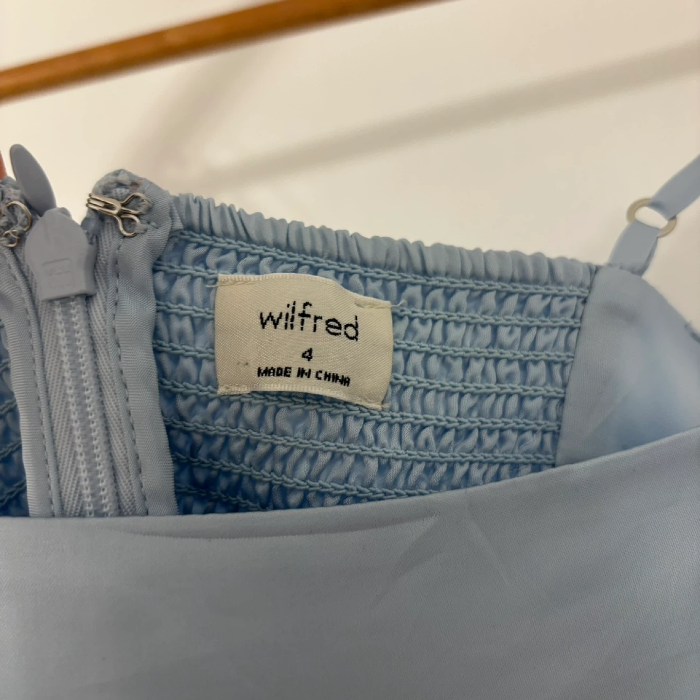 Light blue silky slip dress by Wilfred. It's a size 4 with smocking on the back. Perfect for dressing up or down!
