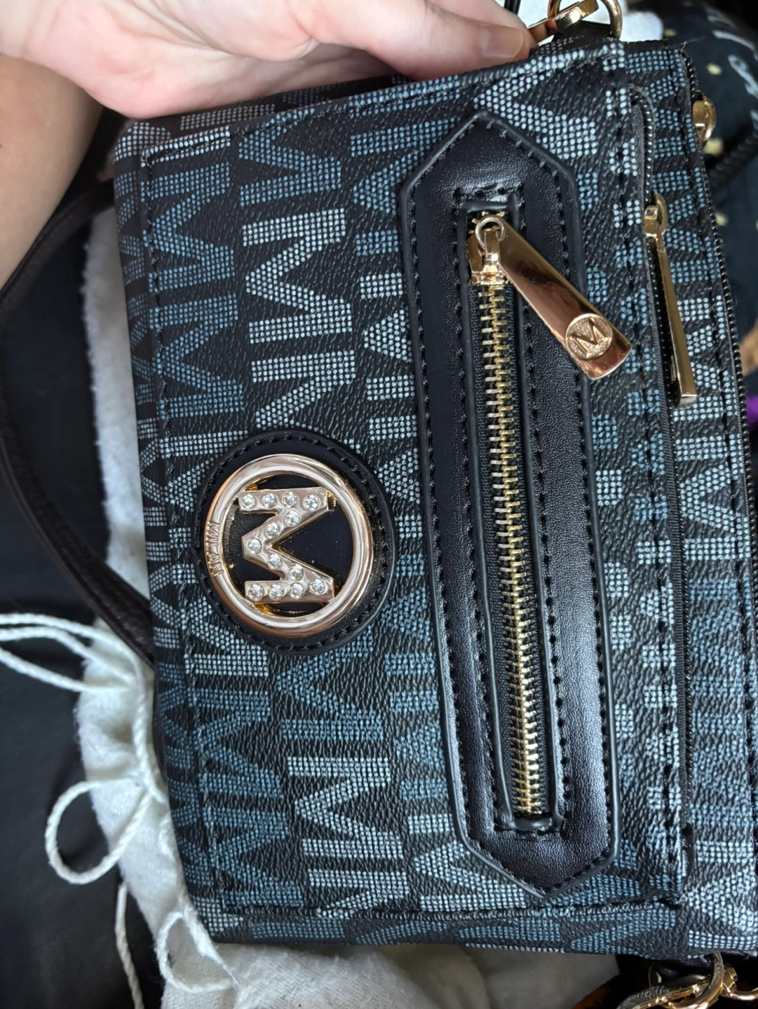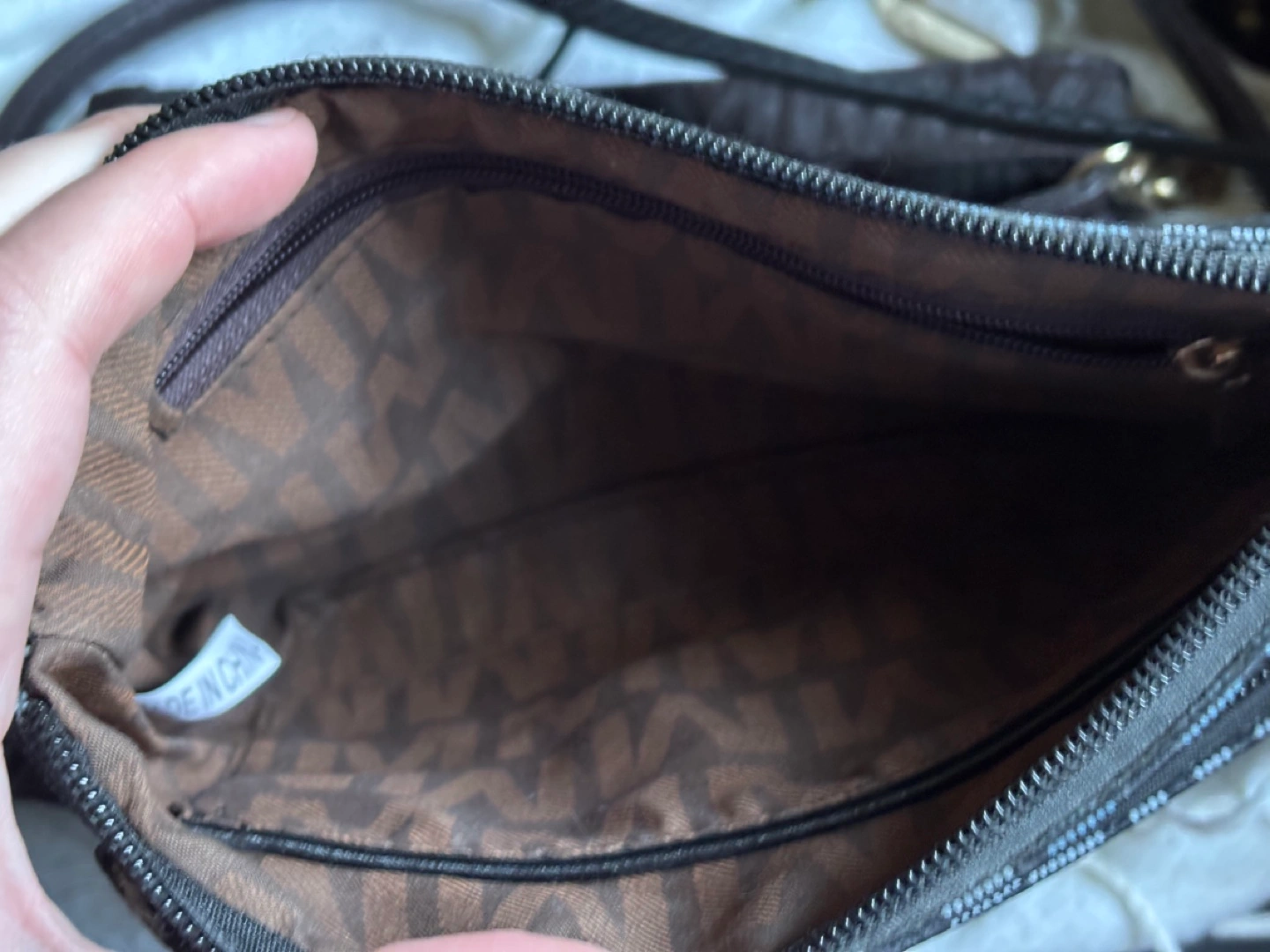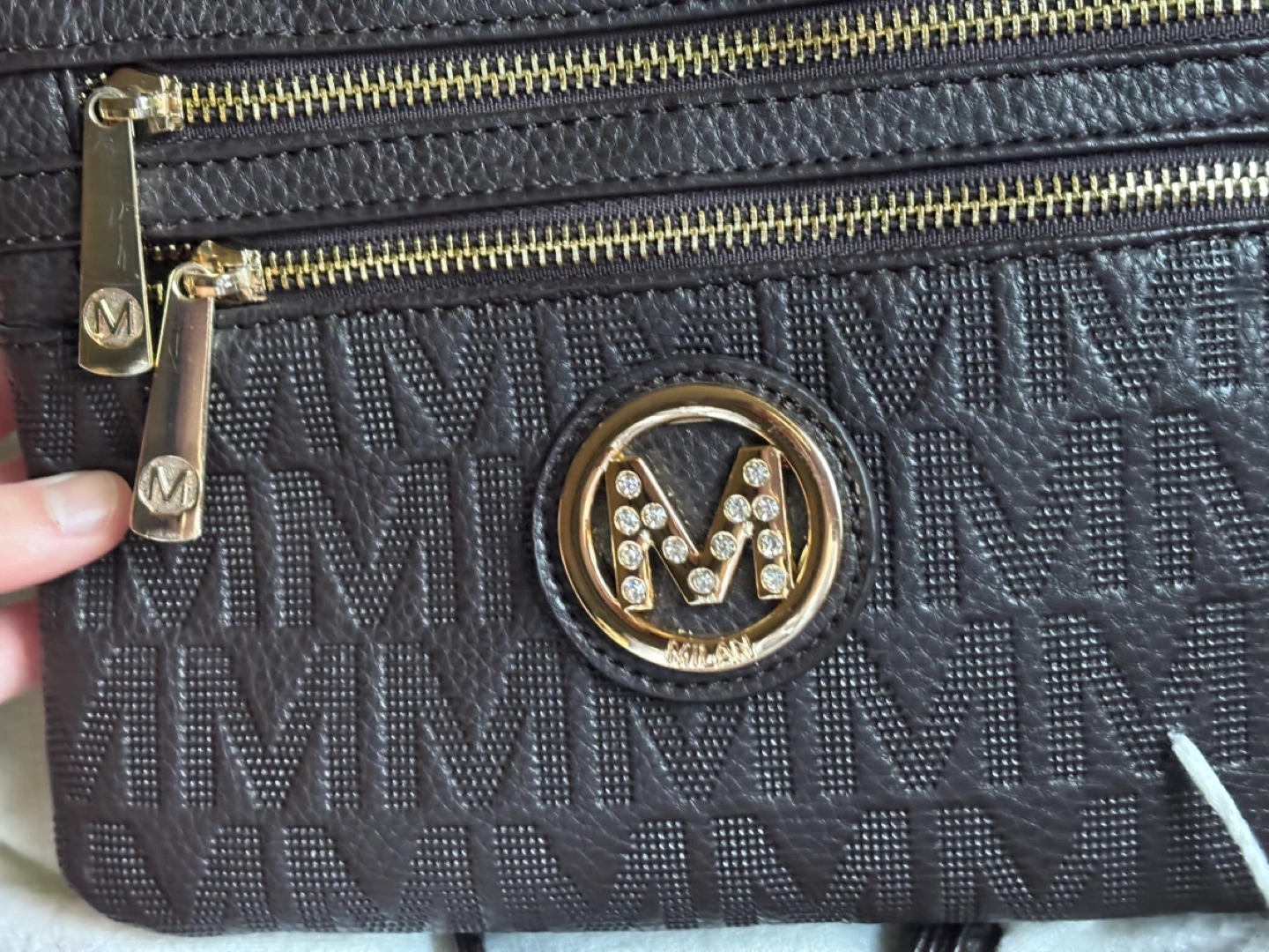 Brown and black and brown crossbody bags. Features multiple zippered compartments. Embossed with repeating brand logo. Gold-toned hardware. Small and compact. One was used once years ago and then put into storage when I started buying my fancier bags.