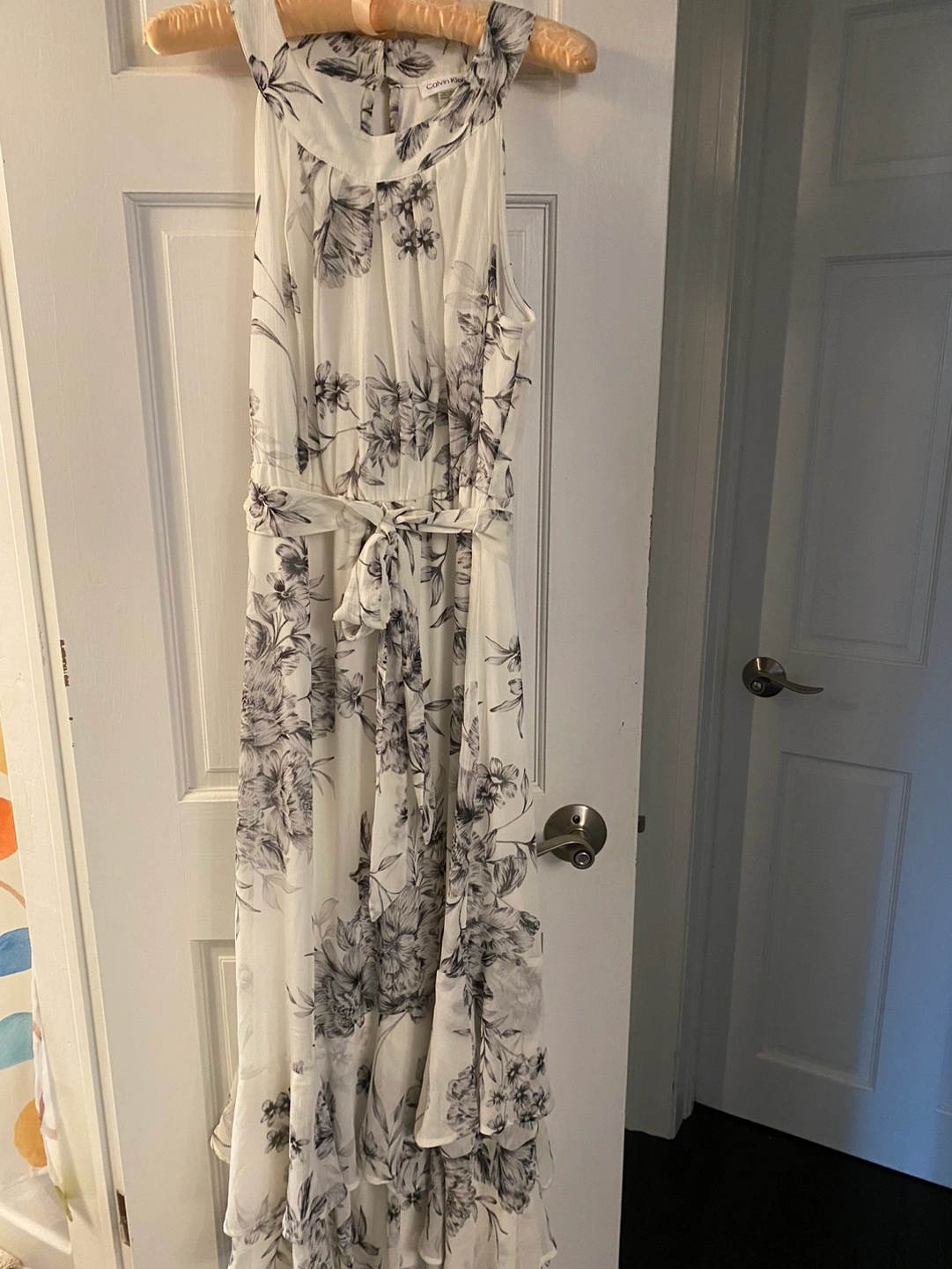 Flattering high/low ruffle maxi dress. Fully lined. Back zipper closure. 100% polyester. Worn once.