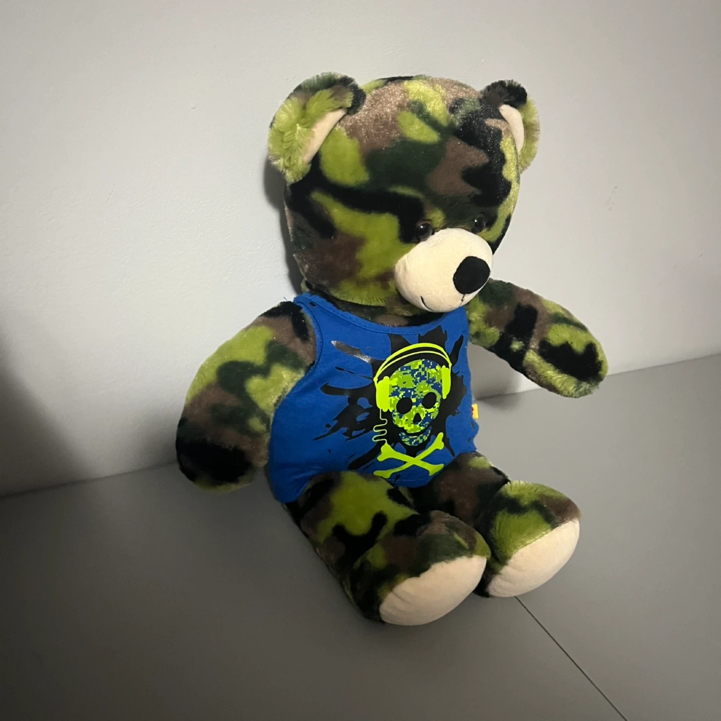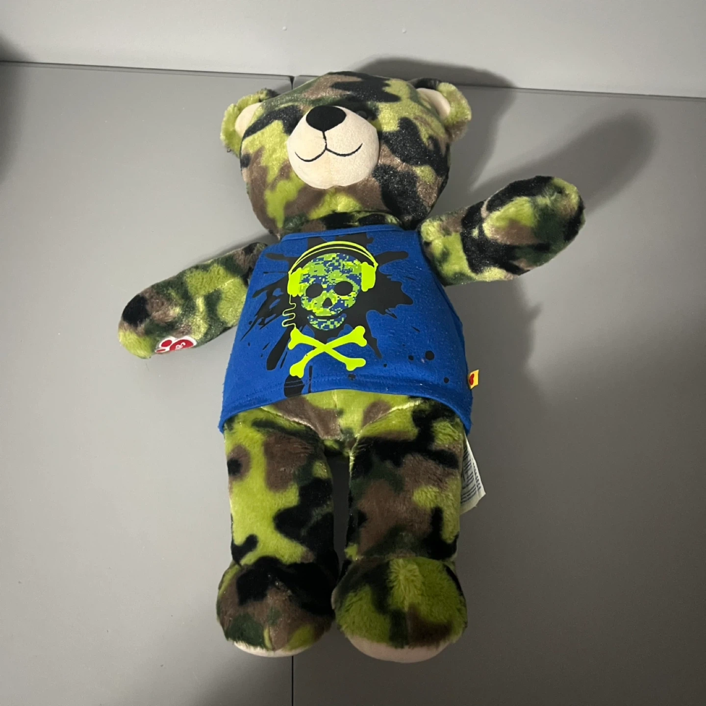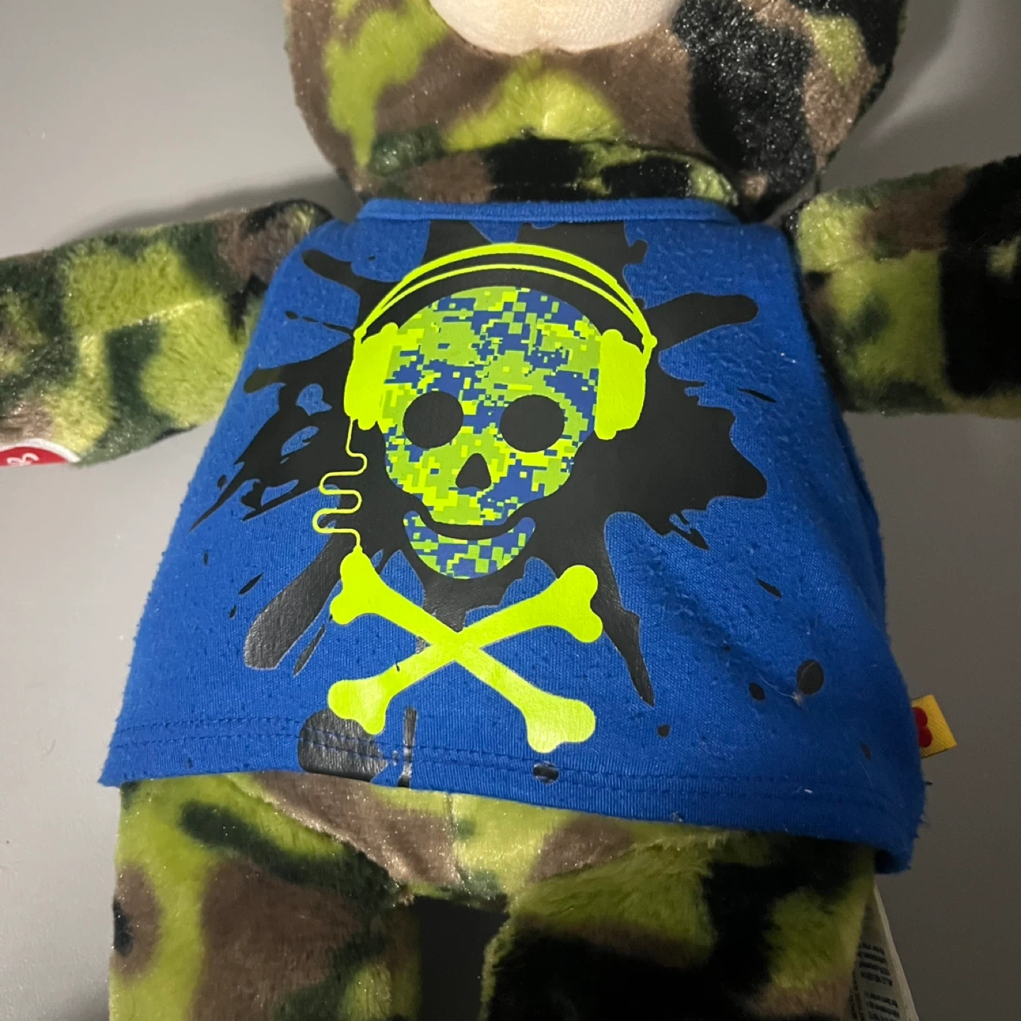 This is a camouflage teddy bear from Build-A-Bear. It's wearing a blue graphic t-shirt featuring a skull with headphones and crossbones. The bear's paw has the classic Build-A-Bear heart logo.