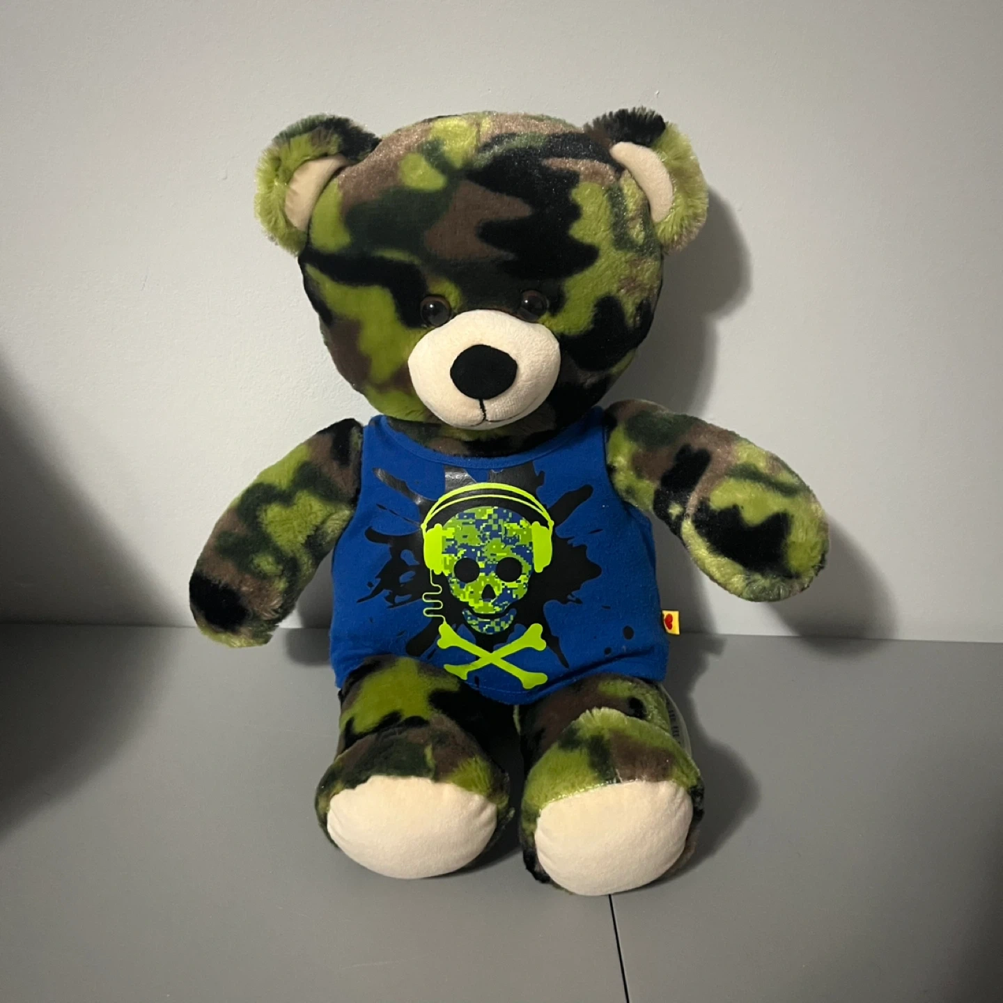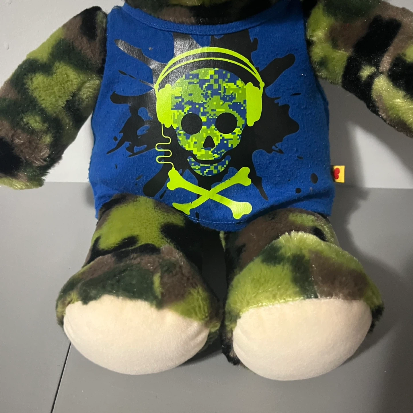 This is a camouflage teddy bear from Build-A-Bear. It's wearing a blue graphic t-shirt featuring a skull with headphones and crossbones. The bear's paw has the classic Build-A-Bear heart logo.