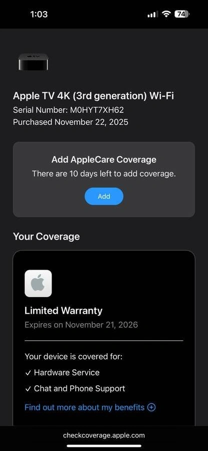 Like new, 9.2/10 condition with some scratches as pictured. Includes original box, power cable, and Siri remote. Under Apple Warranty until Nov 21, 2026. Price is firm. Pickup at Brentwood Mall.