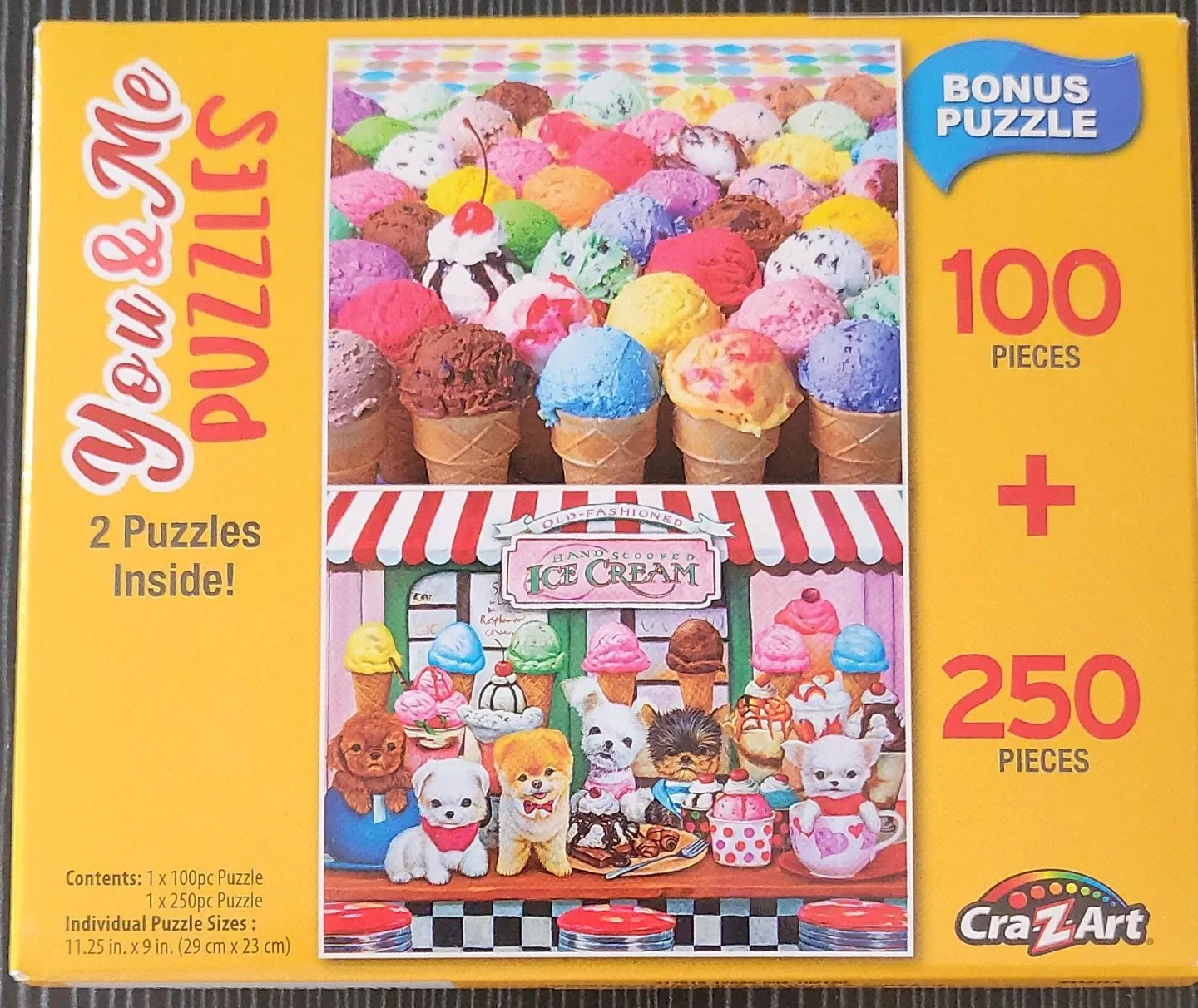 This set includes two puzzles: one with 100 pieces and a bonus puzzle with 250 pieces. Individual puzzle dimensions are 11.25 in. x 9 in. (29 cm x 23 cm). These puzzles are great for a fun afternoon activity!