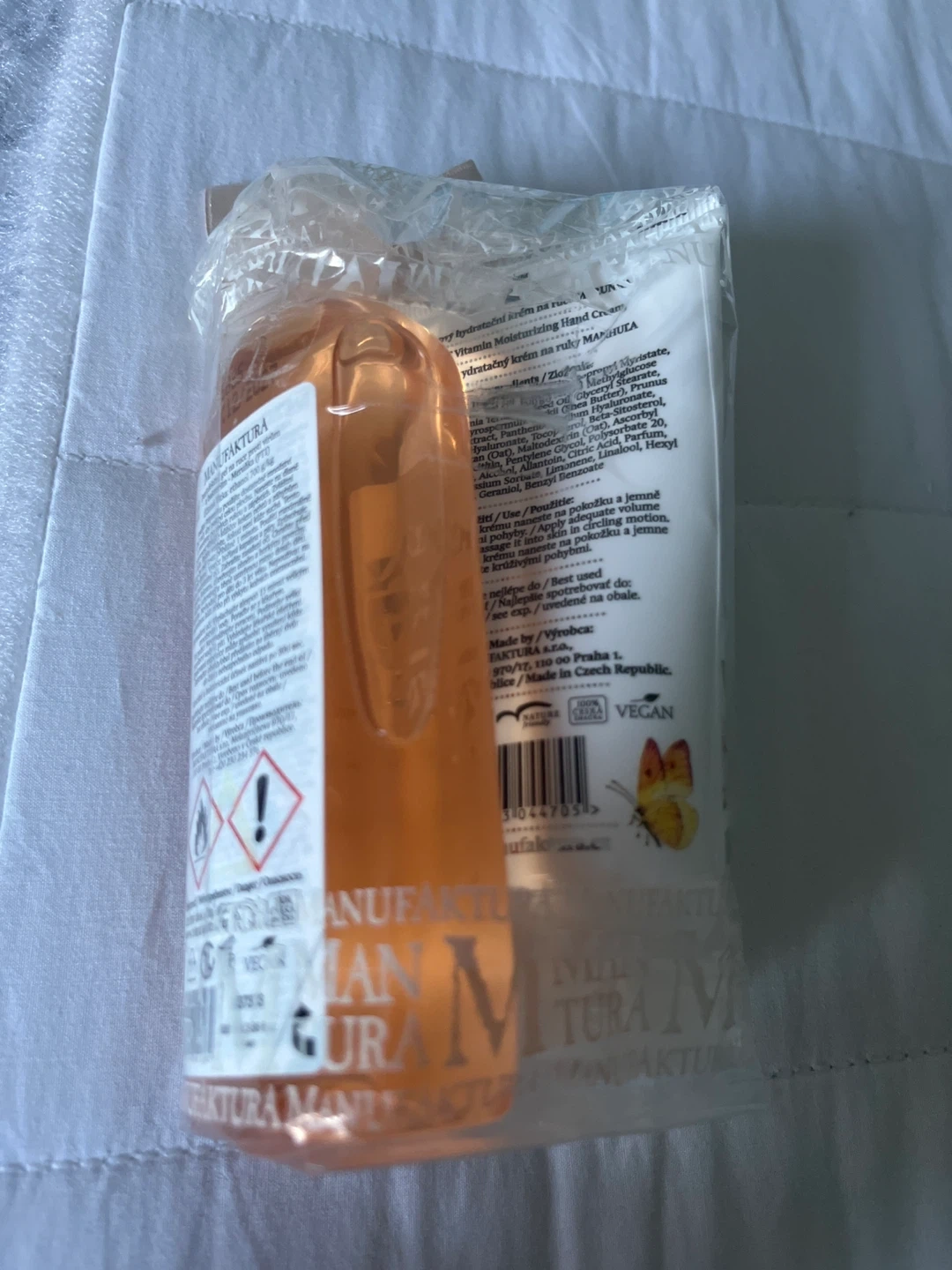 MANUFAKTURA Apricot moisturizing hand cream and revitalizing shower gel gift set. Both are apricot scented and come in a clear plastic bag with a ribbon and tag.