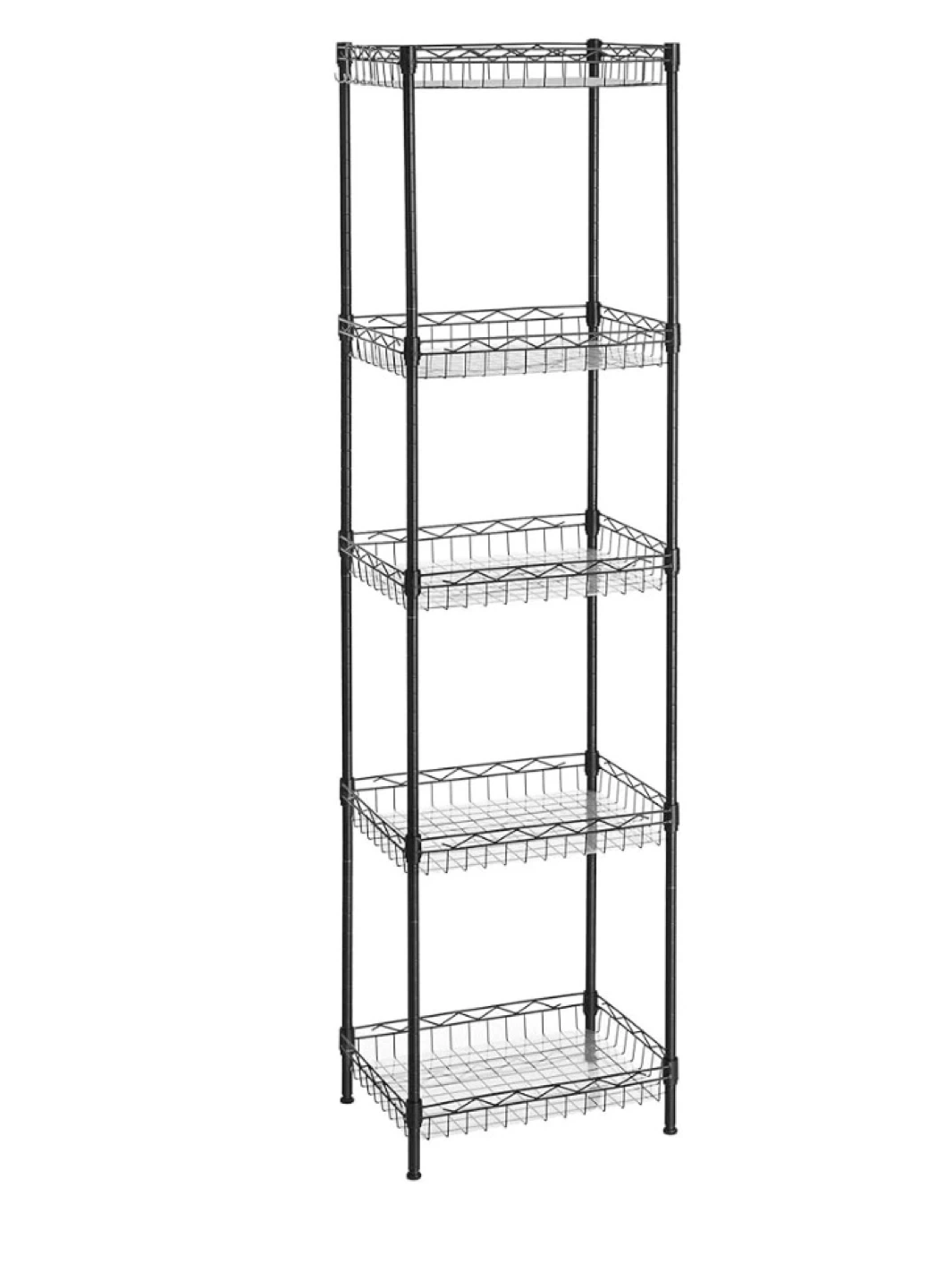 This 5-tier wire shelving unit is black and made of metal. It stands 59.1 inches tall with a depth of 11.8 inches and width of 15.7 inches. Each shelf holds up to 44 lb.