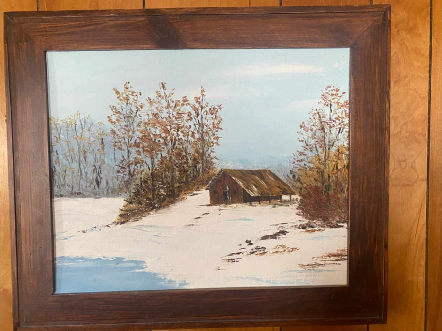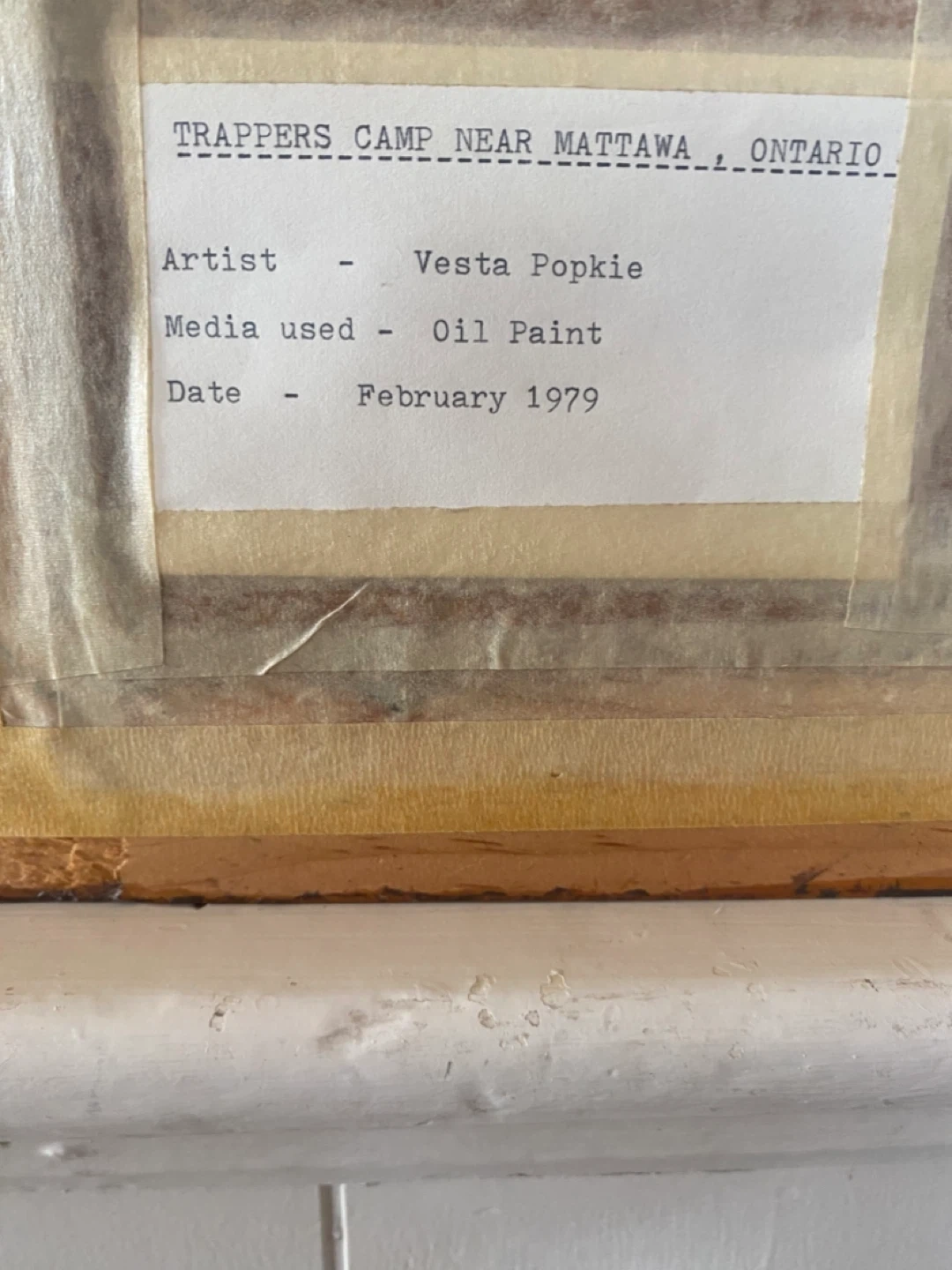 Oil painting by Vesta Popkie titled "Trapper's Camp Near Mattawa, Ontario". Created in February 1979. Features a rustic cabin in a snowy landscape.