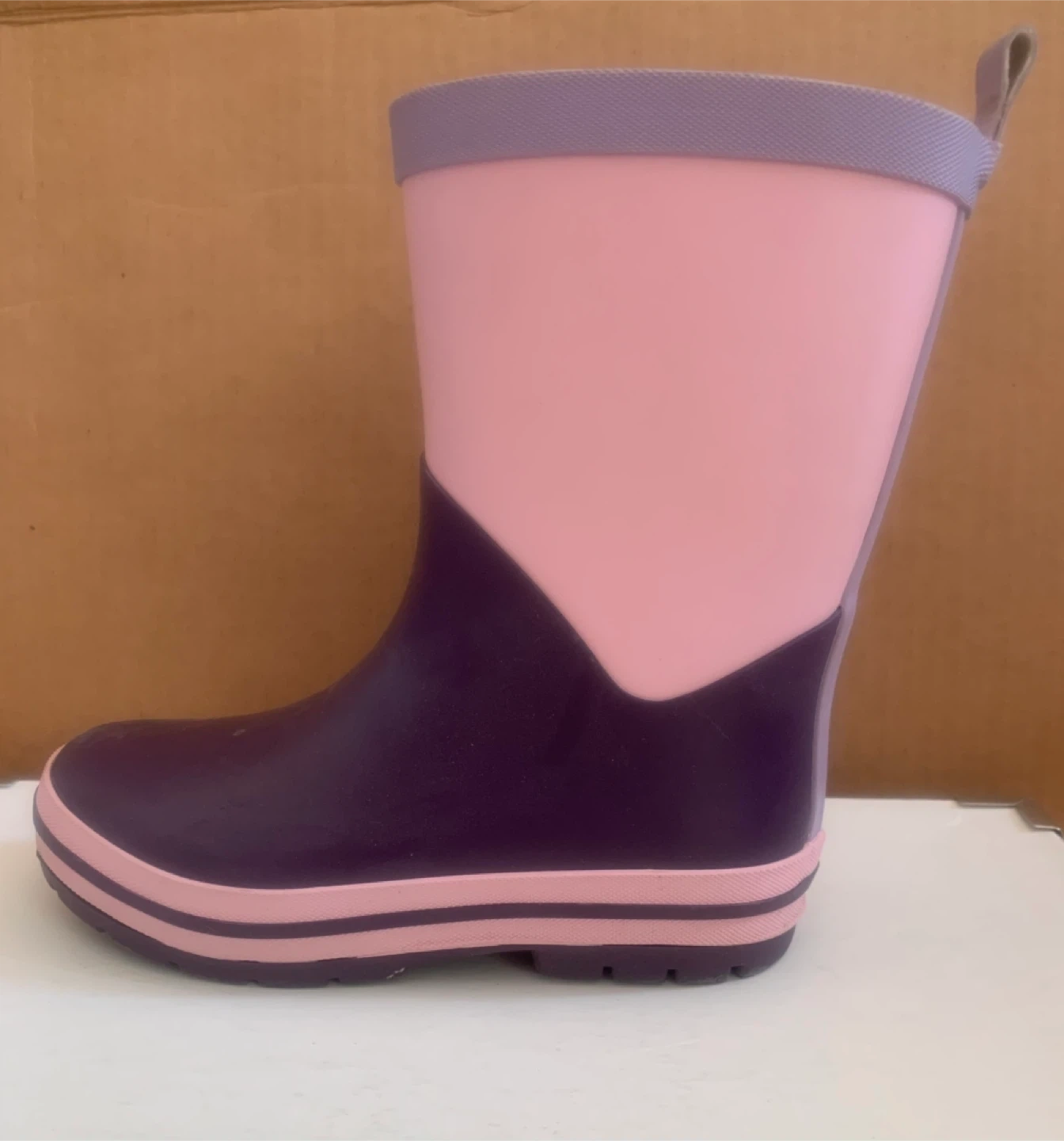 Waterproof rubber rain boots from George in size 13. These have a two-tone pink and purple design with a textured purple sole for grip. Back pull tabs are included for easy dressing.