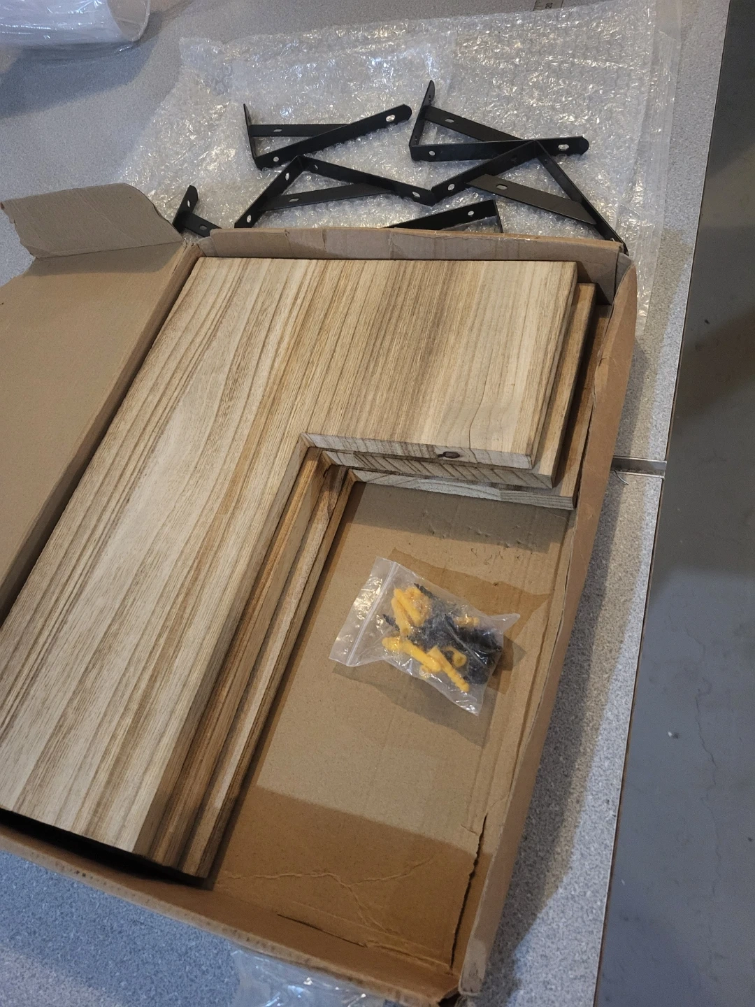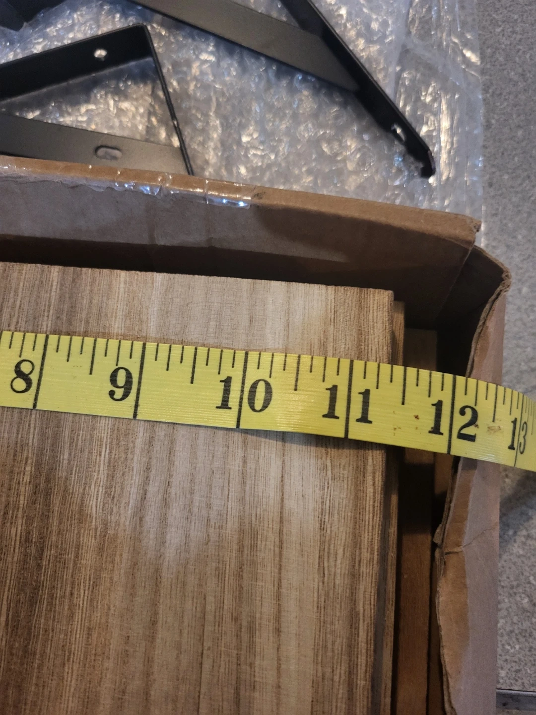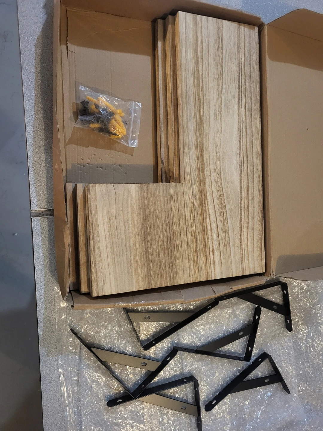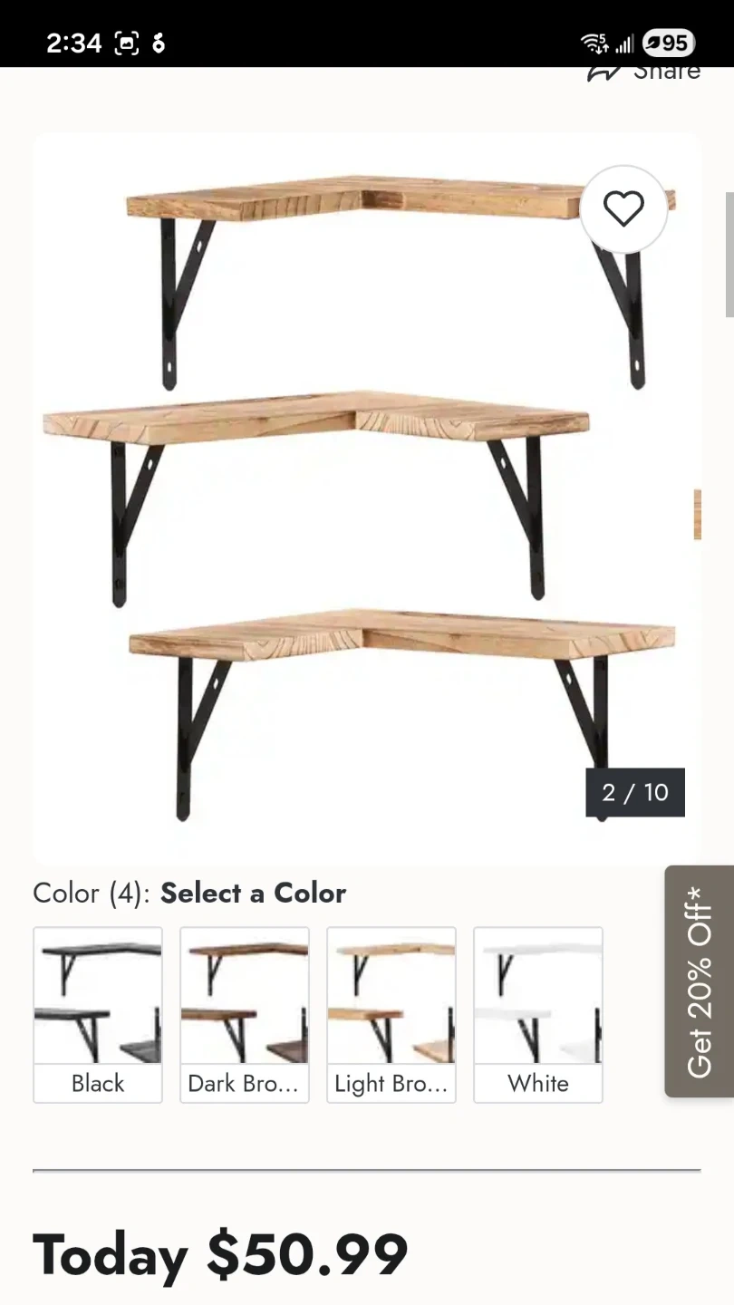 Set of 3 wood floating corner shelves with black metal brackets. Each shelf is approximately 15.7 inches long and 11.4 inches deep. Easy to install for any room's decor!
