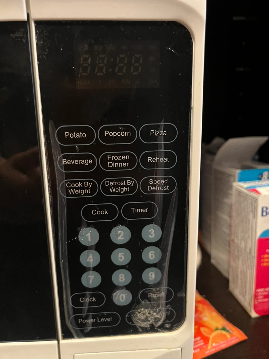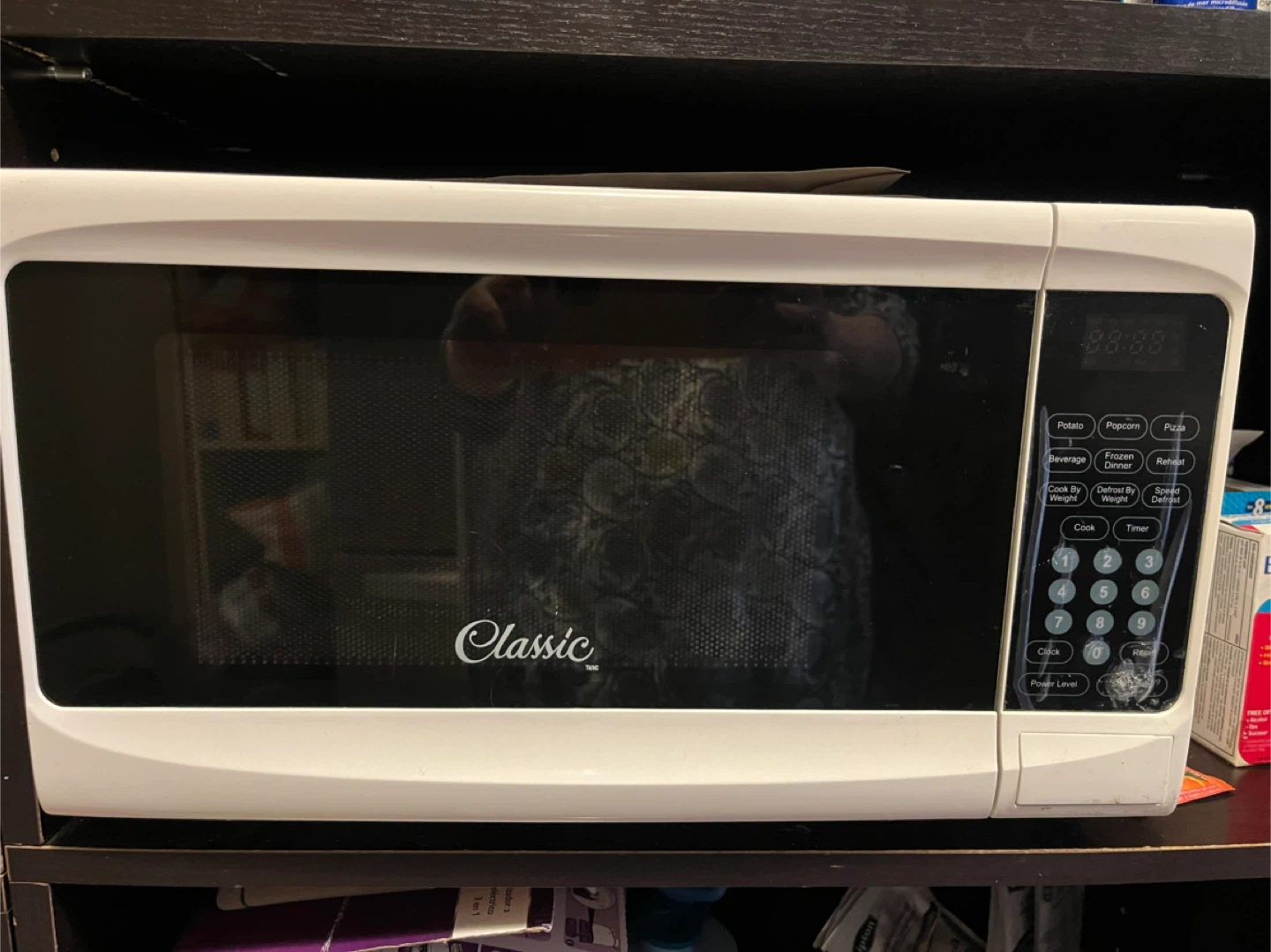 This is a white Classic microwave oven. It features preset cooking options for potato, popcorn, and frozen dinners. It also includes defrost and reheat functions.