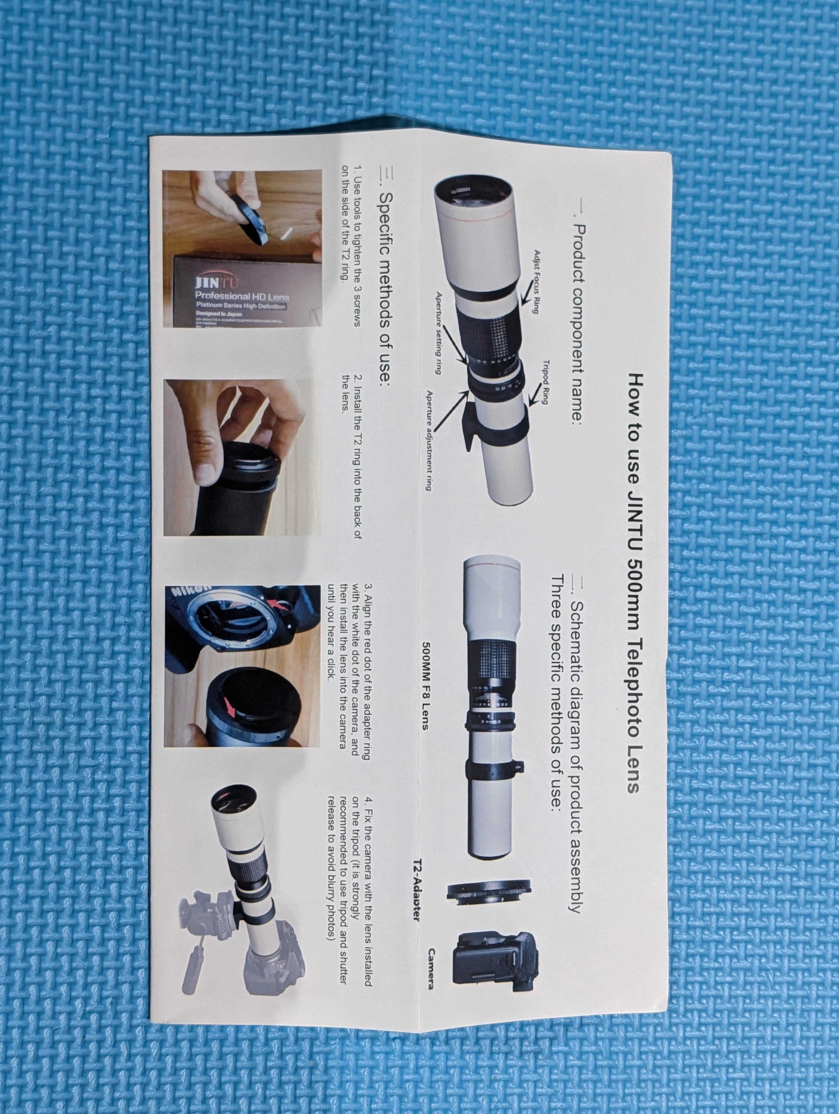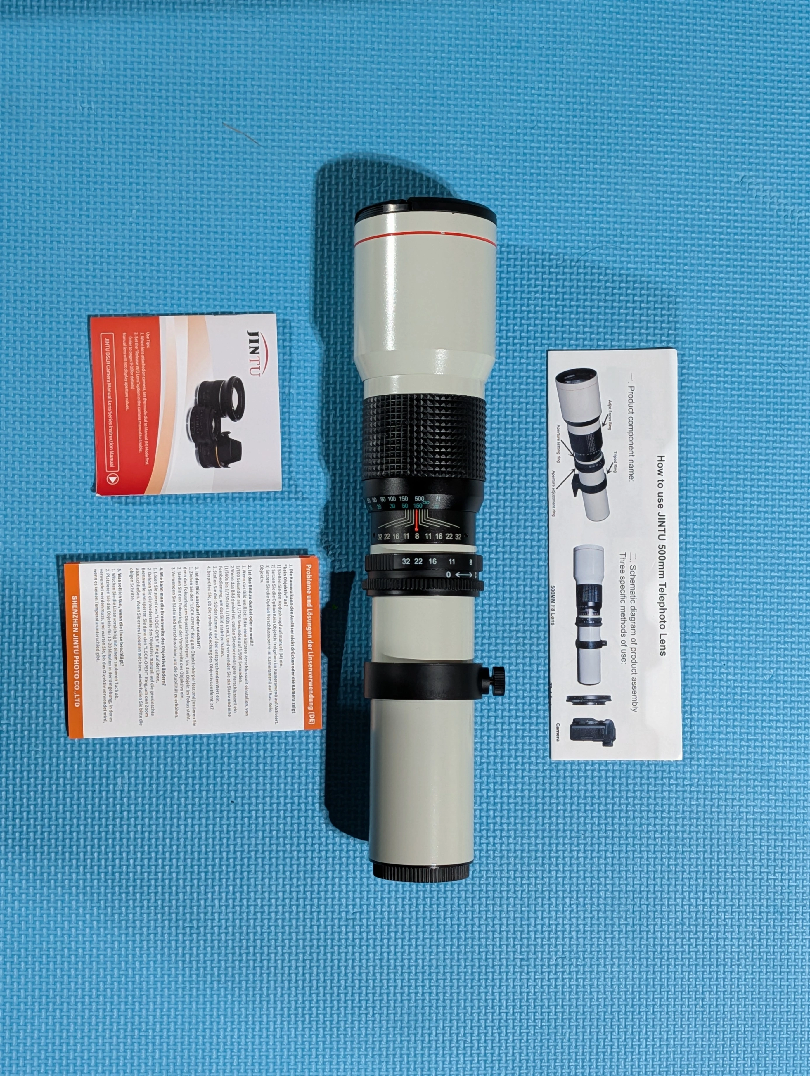 Selling a JINTU 500mm telephoto lens! It comes with the original box and instructions. This lens is designed for use with a T2 adapter and can be mounted on a tripod for stable shooting