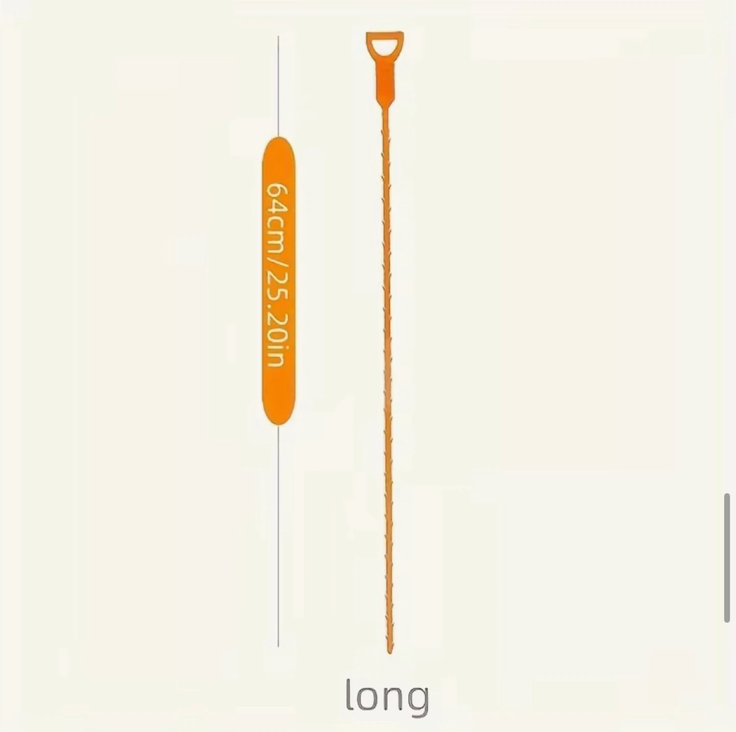 This orange drainage pipe dredger tool is 64cm (25.20 inches) long. It's designed for clearing blockages in kitchen sinks, washbasins, floor drains, and even closestools. Its flexible, barbed design grabs hair and debris easily, making pipe cleaning straightforward!