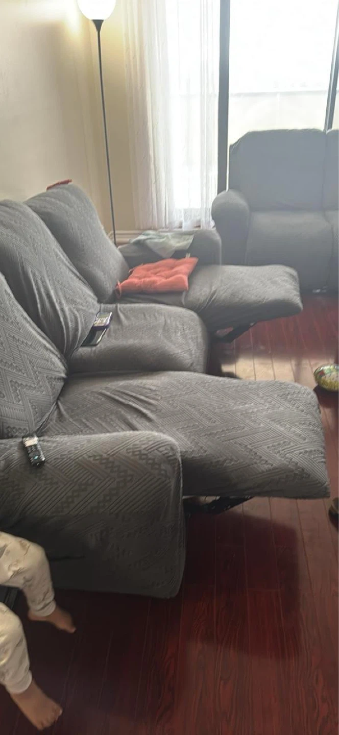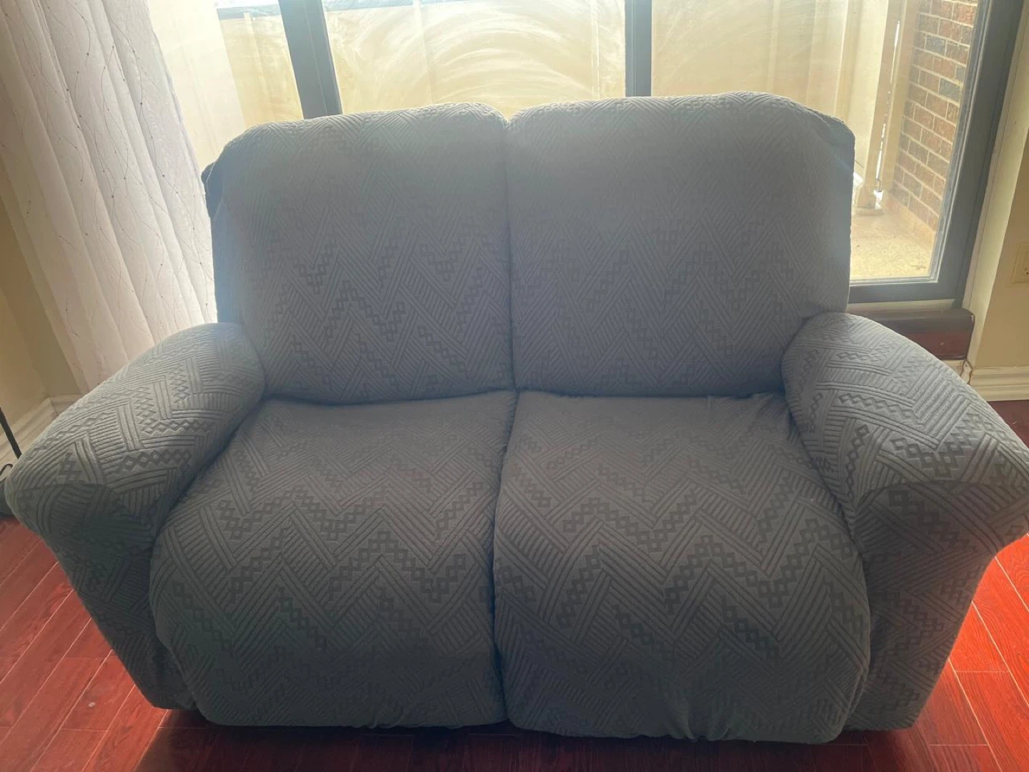 Protective recliner sofa cover in a grey geometric pattern. It's made of a soft fabric material. Fits most double reclining sofas, offering protection from spills and wear.
