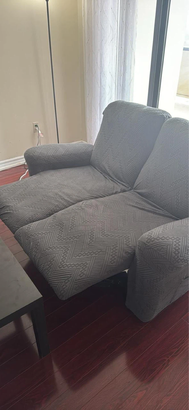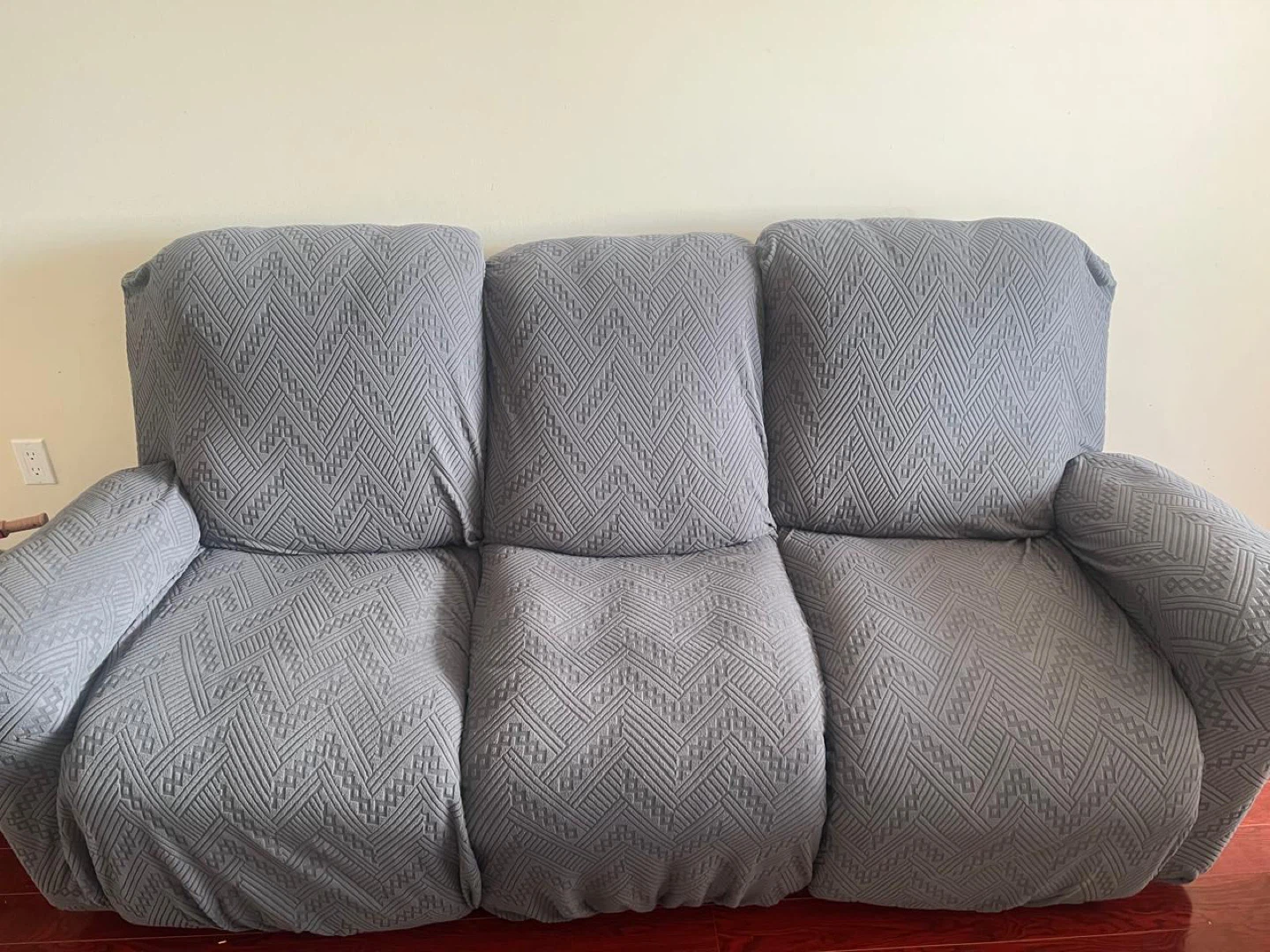 Protective recliner sofa cover in a grey geometric pattern. It's made of a soft fabric material. Fits most double reclining sofas, offering protection from spills and wear.
